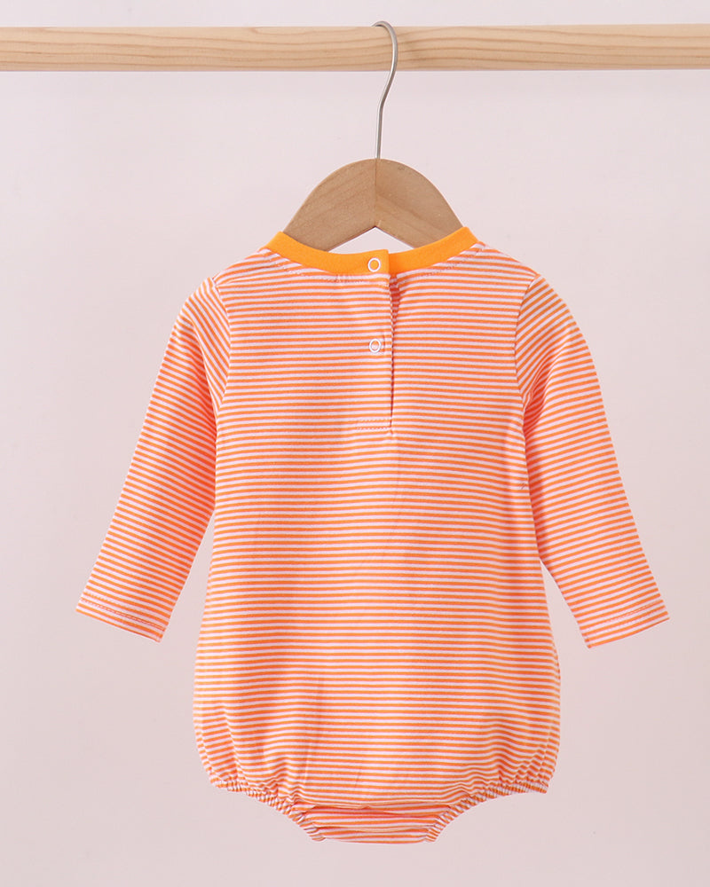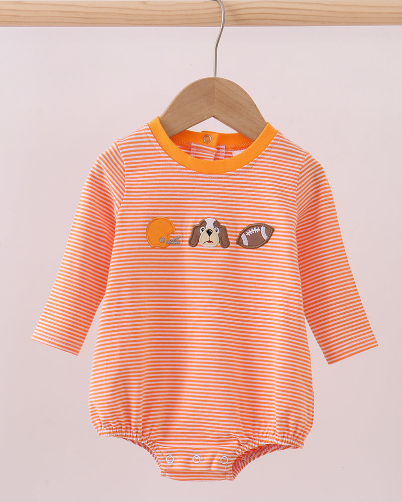 Bring big Rocky Top pride to your tiniest fan! Our Rocky Top Orange Stripes Baby Bubble blends classic southern charm with game-day excitement. Featuring sweet orange pinstripes and an adorable puppy, helmet, and football embroidery, this romper is perfect for cheering on your favorite team — from Neyland watch parties to Saturday tailgates.