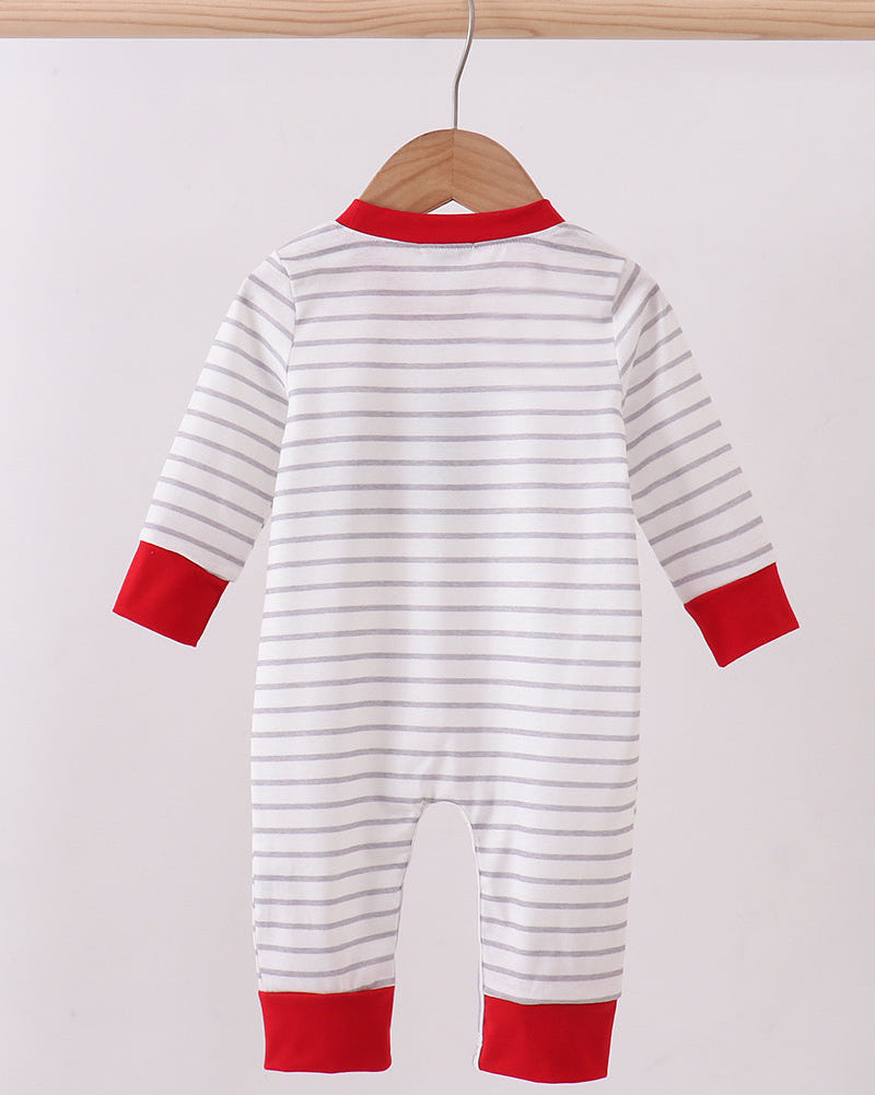 Perfect for little ones who love vehicles, the Truck & Cars Embroidered Stripe Baby Romper combines playful charm with everyday comfort. This adorable romper features soft gray stripes accented with bold red trim and sweet embroidered trucks and cars across the chest for a classic, boy-friendly look.