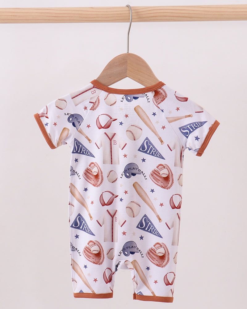 The Little Slugger Baseball Bamboo Zip Romper is a home run for comfort and cuteness. Made from ultra-soft bamboo fabric, this one-piece romper features an allover baseball-themed print with bats, balls, gloves, and sporty details that little fans will love.