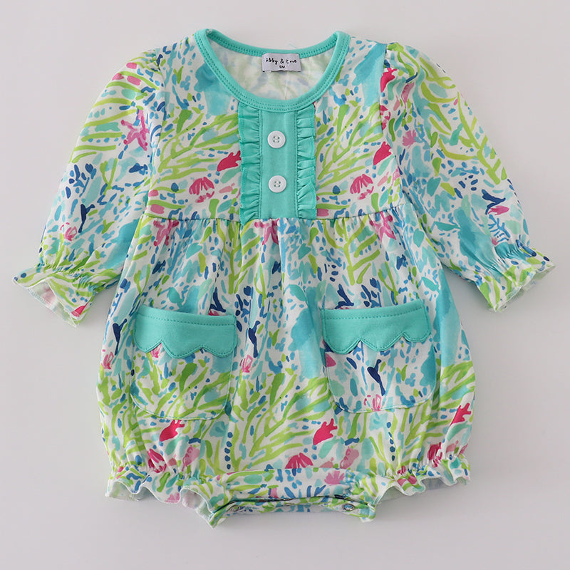Add a pop of color to your baby girl’s wardrobe with the Green Meadow Splash Ruffle Bubble! Featuring a vibrant watercolor meadow print, ruffle button placket, and scalloped pocket details, this playful one-piece is perfect for spring and summer outings. Soft fabric and elastic leg openings ensure all-day comfort.
