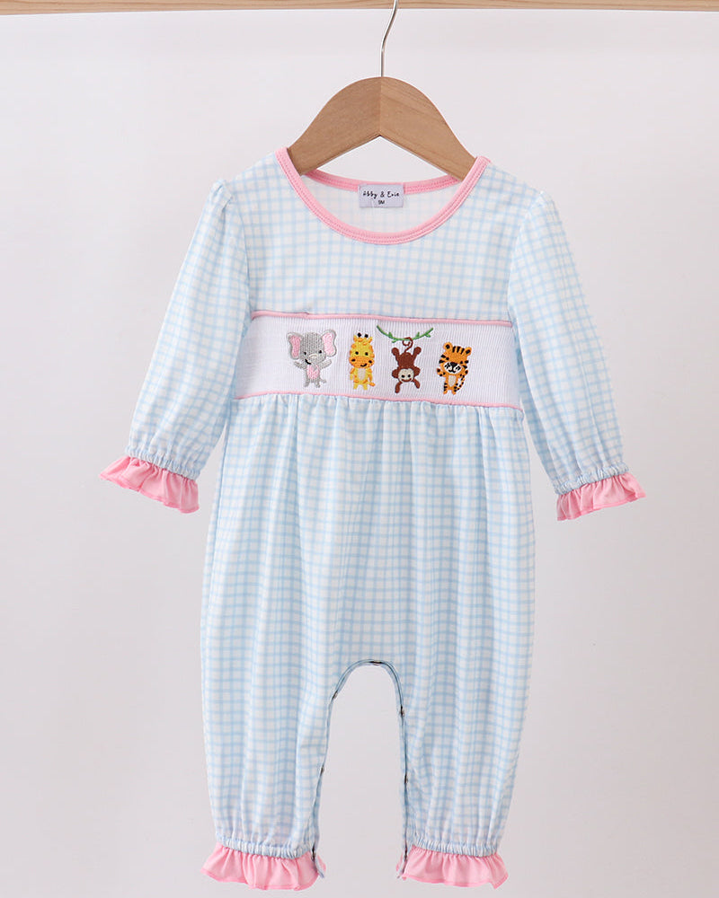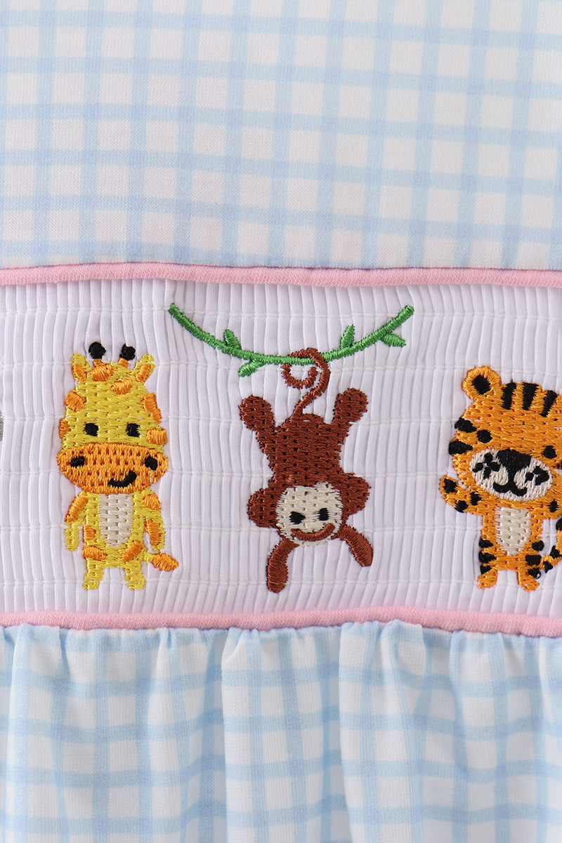 • 🧵 Smocked panel with adorable embroidered zoo animals (elephant, giraffe, monkey, tiger)