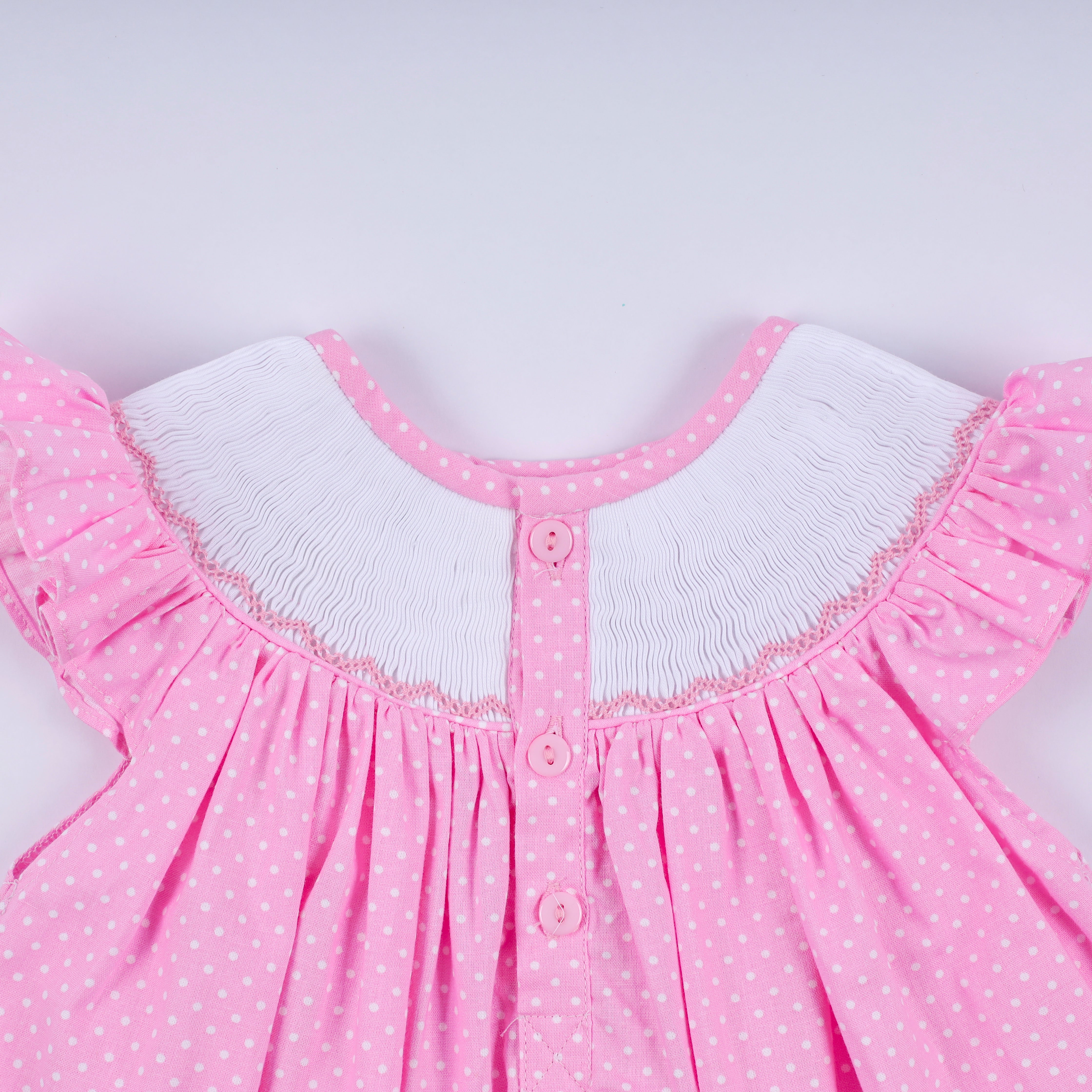 • Pink polka dot fabric with adorable ruffle sleeves
