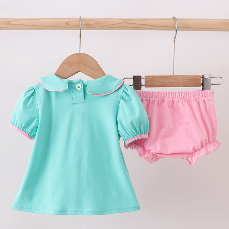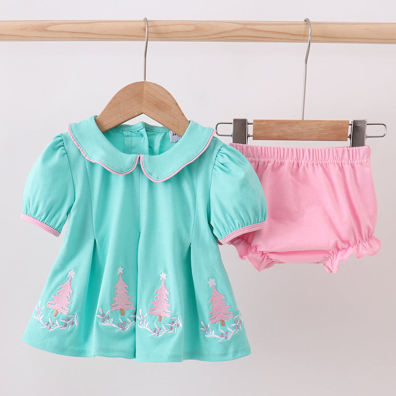 Bring festive joy to her wardrobe with the Magic of Christmas Tree Baby Bloomer Set. This darling holiday outfit features a mint green tunic adorned with pink embroidered Christmas trees, trimmed with sweet piping for a classic seasonal look. Paired with coordinating pink bloomers, this set is perfect for holiday celebrations, family photos, and cozy Christmas mornings.