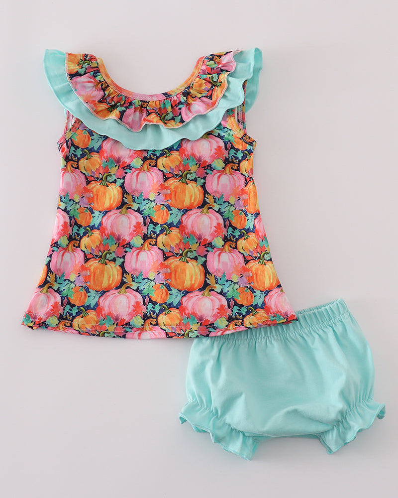 Bring vibrant fall fun to your little one’s wardrobe with our Pumpkin Party Ruffle Bloomer Set. This adorable two-piece features a lively pumpkin print top in shades of pink, orange, and teal, trimmed with a double ruffle neckline in coordinating aqua and pumpkin hues.