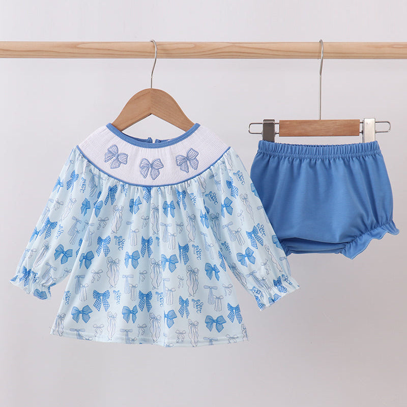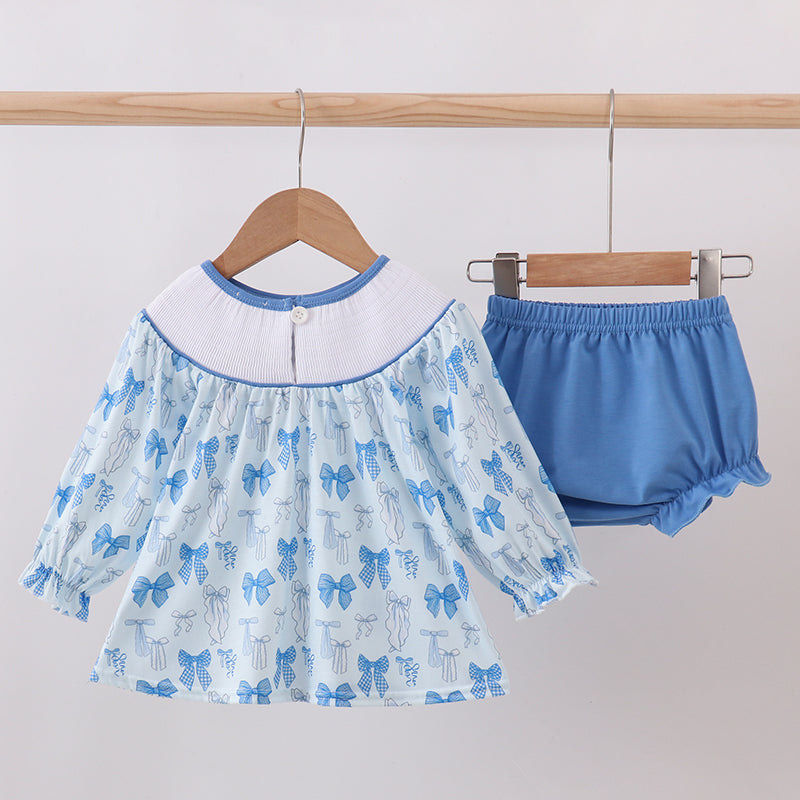 Your little one will shine in our Sky Bow Smocked Bloomer Set, a timeless design full of charm and comfort. The smocked neckline features delicately embroidered blue bows that perfectly match the soft floral-and-bow print. Paired with coordinating bloomers, this outfit is ideal for everyday elegance or special occasions.
