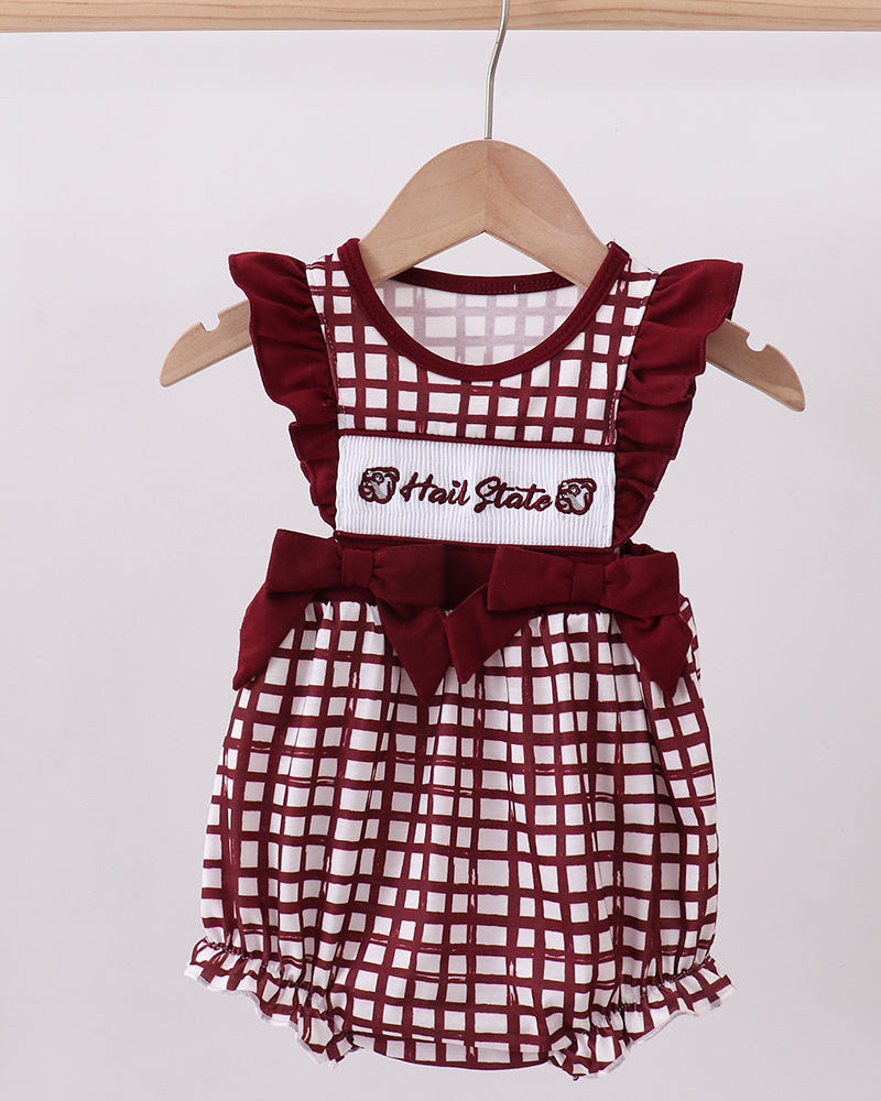 Your littlest Bulldog will be game day ready in the Hail State Game Day Smocked Gingham Ruffle Bubble. Featuring classic maroon gingham, sweet ruffle details, and a smocked “Hail State” embroidery, this bubble is the perfect blend of Southern charm and Mississippi State pride.