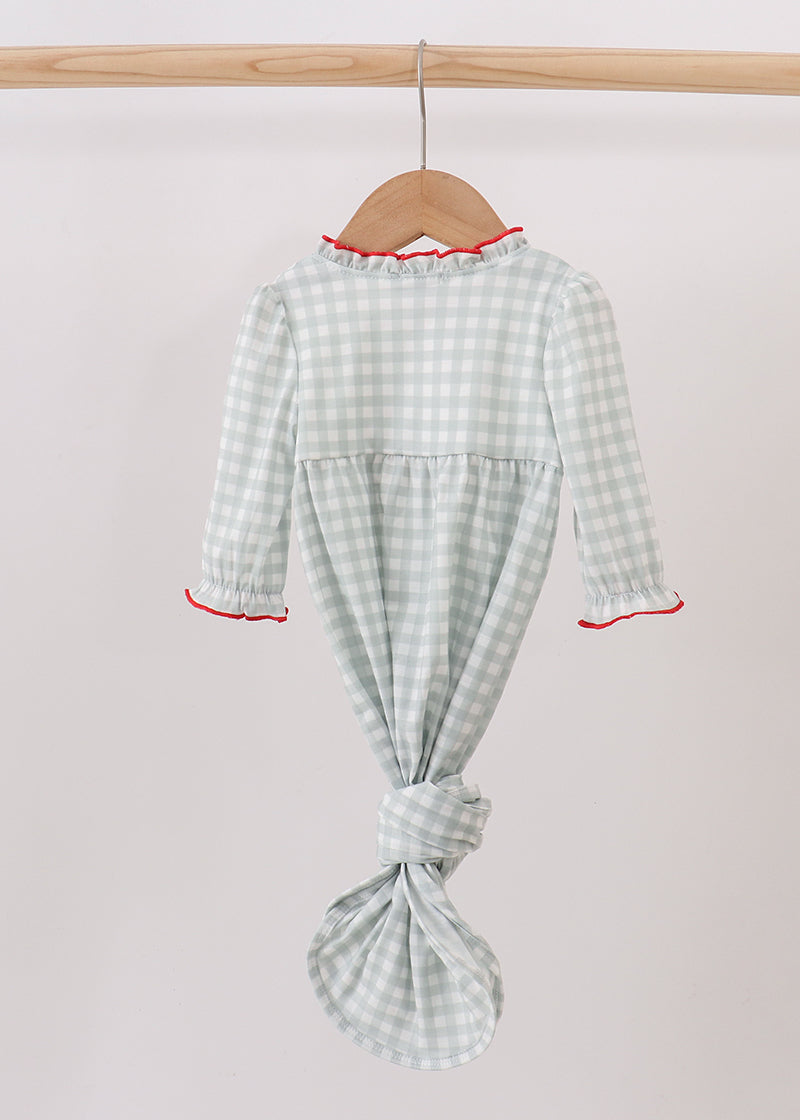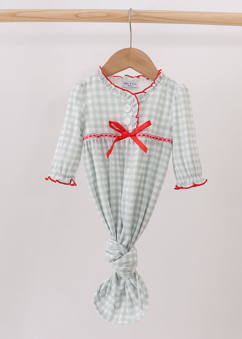 Wrap your little one in timeless holiday charm with our Holiday Bow Sage Gingham Baby Gown. Featuring a soft sage gingham print, sweet red ribbon bow detail, and delicate ruffle trim, this gown is designed for both comfort and festive style. The knotted gown bottom allows for easy diaper changes, while the breathable fabric keeps baby cozy all night long. Perfect for Christmas photos, holiday gatherings, or as a precious seasonal gift.