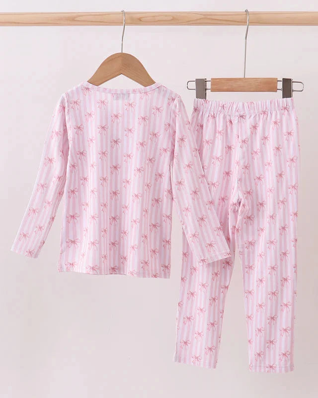 Cozy nights just got sweeter with the Blush Belle Bow Bamboo Pajama Set. Made from ultra-soft, breathable bamboo fabric, this two-piece pajama set keeps your little one comfortable all night long. The delicate blush pink hue with dainty bow patterns adds a charming touch, while the gentle stretch ensures easy movement and restful sleep.