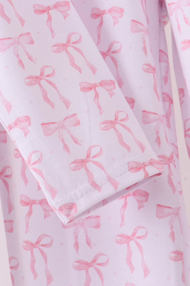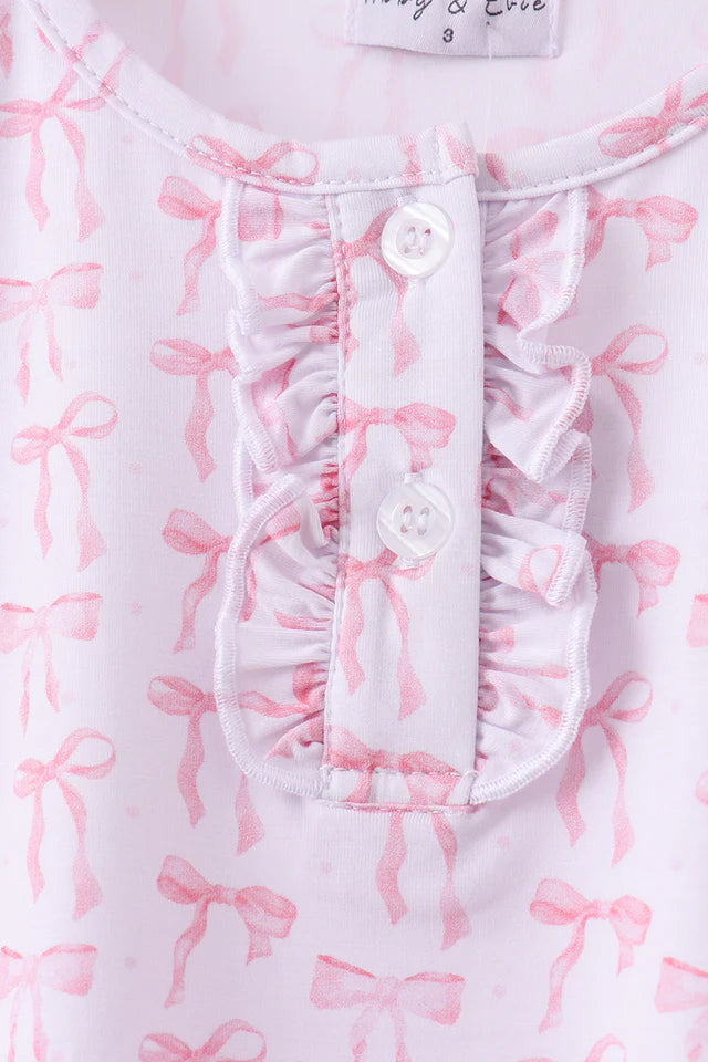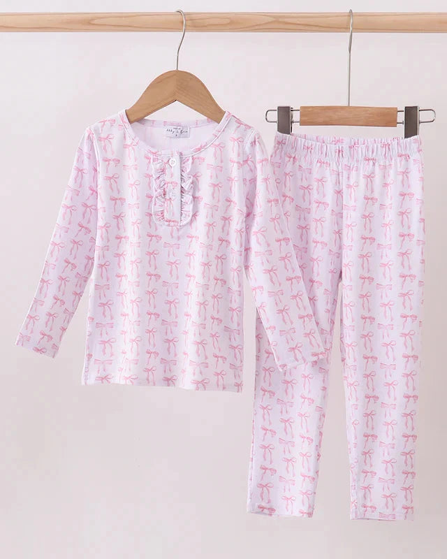Sweet dreams start with the Lovely Little Bows Bamboo Girl Pajama Pants Set. Designed with a dainty pink bow print on a soft white base, this set combines timeless charm with the unmatched comfort of bamboo fabric. The long-sleeve top features delicate ruffle button details, while the matching pants offer a stretchy waistband for the perfect fit.