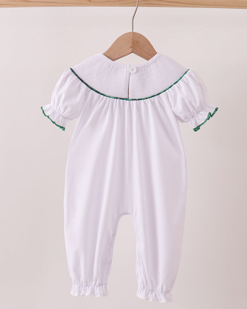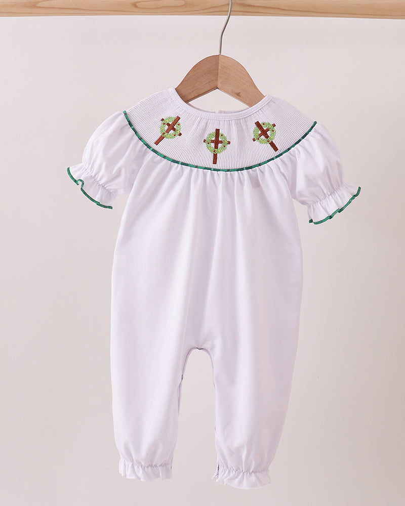 Dress your little one in timeless holiday charm with the Christmas Blessings Wreath Smocked Baby Romper. This classic white romper features hand-smocked wreath embroidery across the chest, symbolizing love, joy, and the spirit of Christmas.