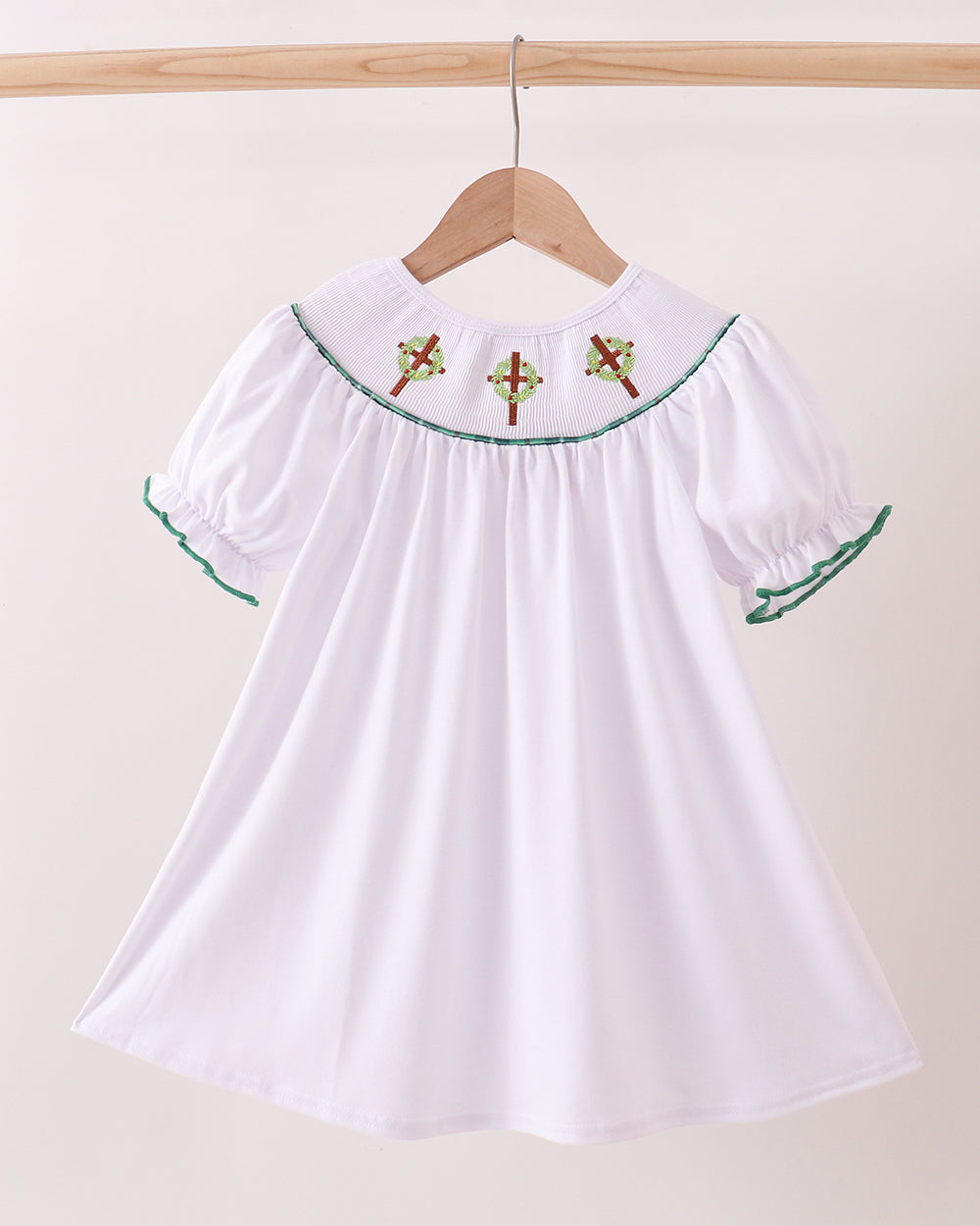 - ✝️ Faith-Inspired Smocking – Hand-stitched wreath and cross embroidery across the neckline.