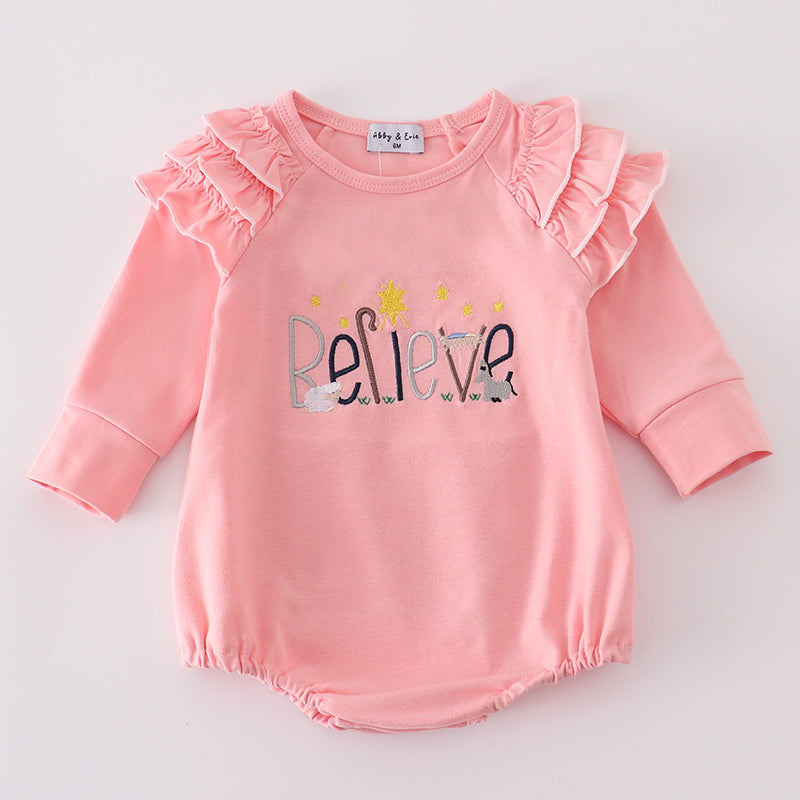 Celebrate the magic of childhood with the Pastel Believe Baby Girl Bubble. This charming pink bubble romper features delicate ruffle sleeves and sweet embroidery with the word “Believe”, adorned with pastel accents and twinkling stars. Made from soft, breathable fabric, it offers comfort and style for your little one’s special moments.