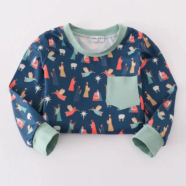 Make his holiday nights extra cozy with our Navy Nativity Boy Lounge Set. Designed with a joyful nativity scene print on a deep navy background, this two-piece pajama set brings comfort, warmth, and festive spirit to bedtime.