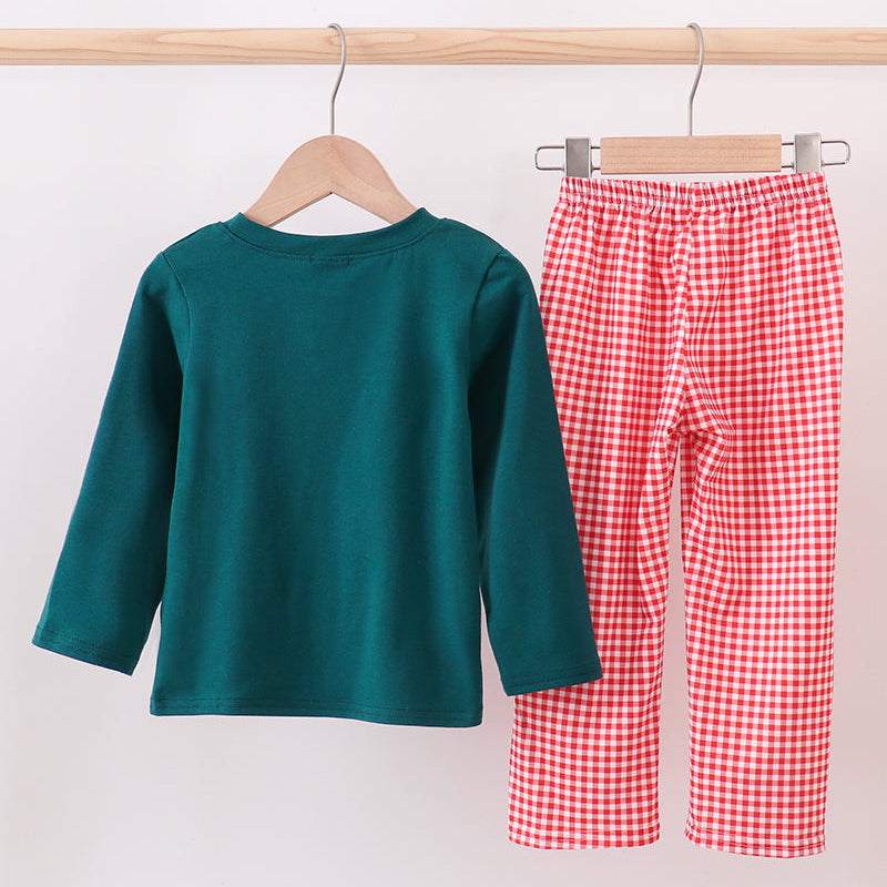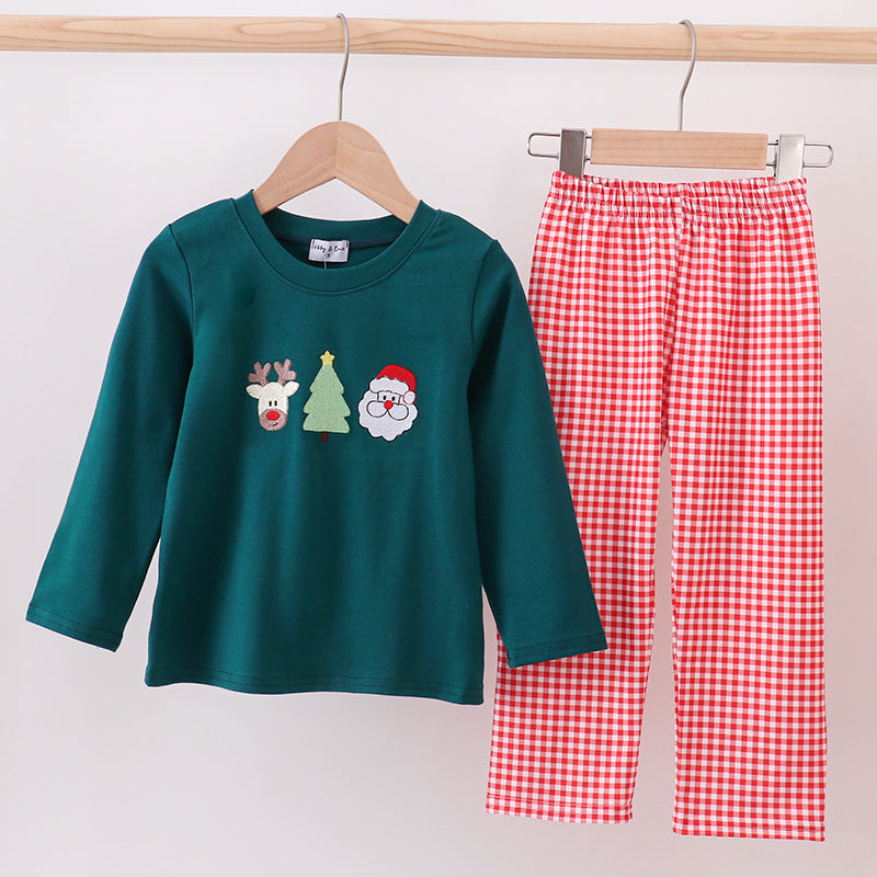 Get your little one ready for holiday fun with the Santa’s Holiday Party Green Boy Pants Set. This cheerful outfit includes a green long-sleeve top decorated with playful Christmas appliqués—a smiling reindeer, a festive tree, and jolly Santa. Paired with classic red gingham check pants, this set is perfect for cozy celebrations, family dinners, or holiday photo shoots.