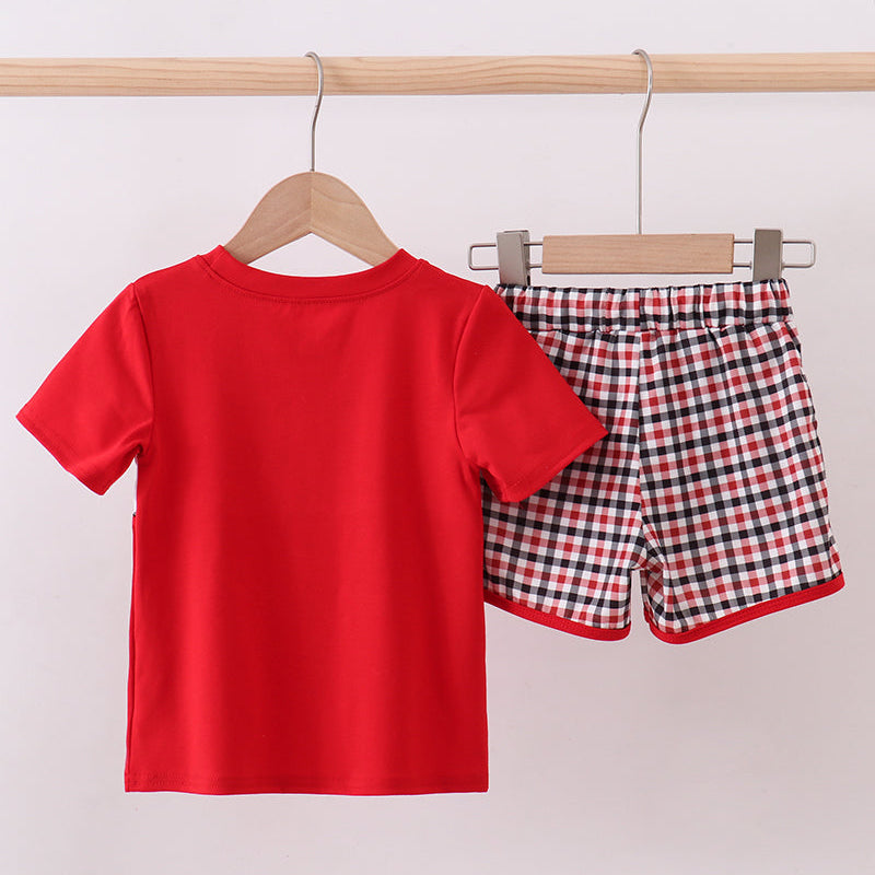 Your little fan will be game-day ready in the Go Dawgs Sideline Smocked Plaid Boy Shorts Set. This classic two-piece outfit features a bold red short-sleeve tee with Go Dawgs smocked embroidery, paired with coordinating red, black, and white plaid shorts for a timeless team look.