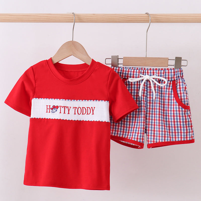 Get your little fan ready to cheer in classic Southern style with the Hotty Toddy Game Day Smocked Boy Shorts Set. This two-piece outfit features a bright red short-sleeve top with a smocked chest panel embroidered with “Hotty Toddy,” offering a timeless and spirited game day look.