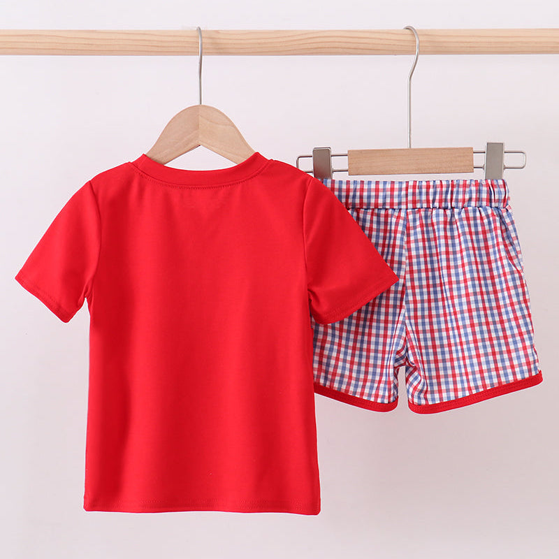 Paired with coordinating red, white, and blue gingham shorts designed with an elastic waistband and adjustable drawstring, this set provides comfort and easy movement all day long. Perfect for football season, tailgates, family photos, and game day celebrations, it’s a must-have for young fans.