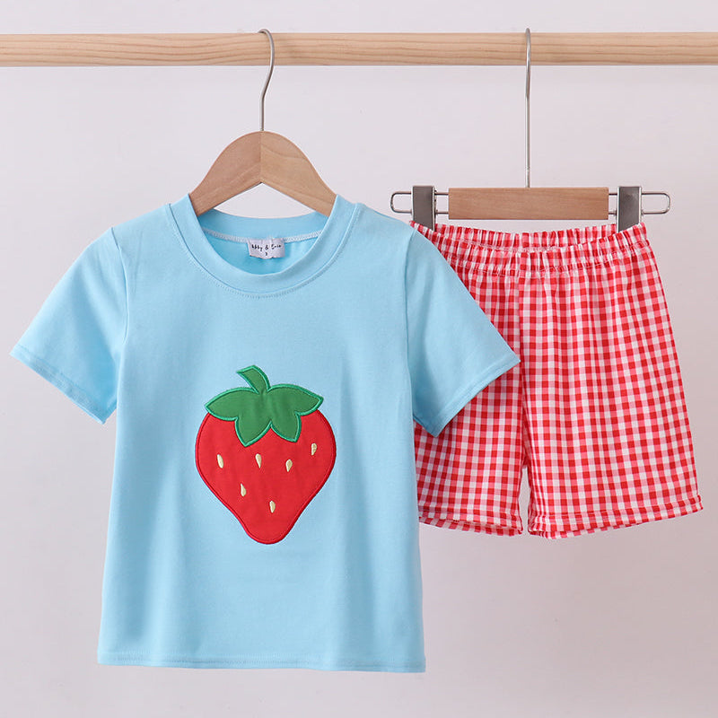 The Strawberry Sprinkle Gingham Boy Shorts Set brings fresh, playful charm to your little one’s summer wardrobe. This sweet two-piece outfit features a soft sky-blue short sleeve tee with a bold strawberry applique front and center, perfectly paired with classic red gingham shorts for a timeless look.