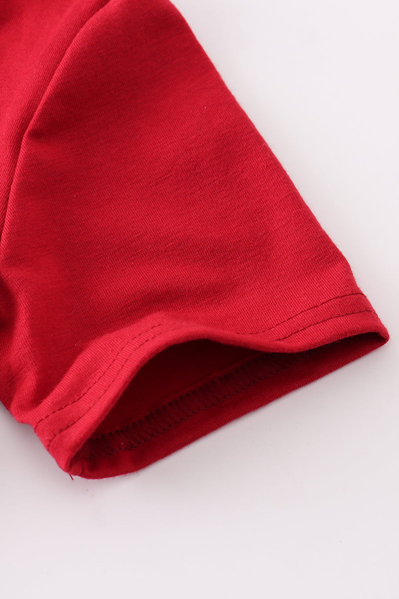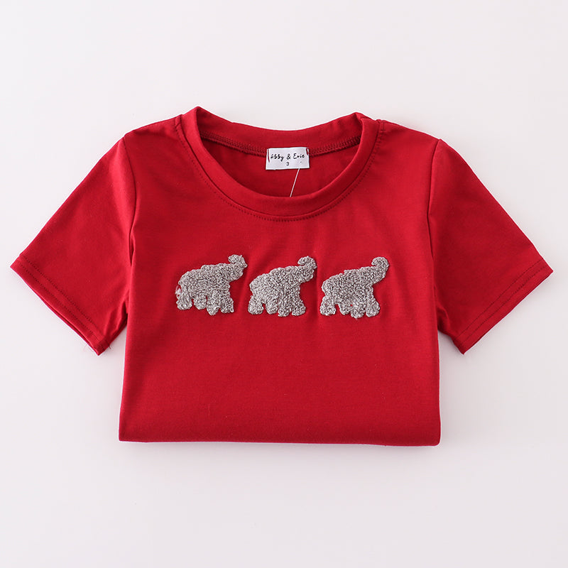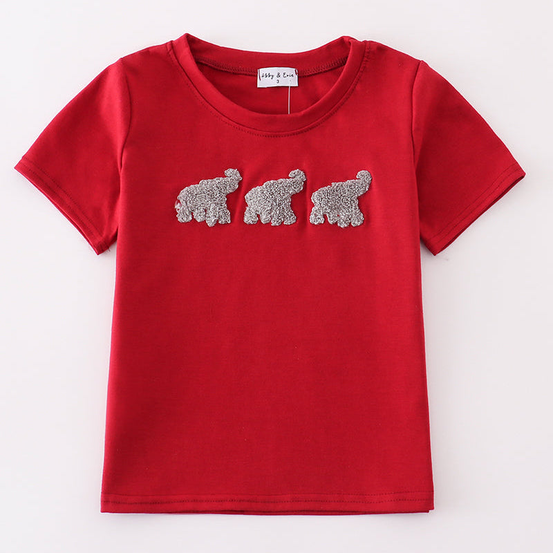 The Crimson Elephant French Knot Boy Top is the perfect blend of timeless Southern style and team spirit. This classic crimson short-sleeve shirt features three hand-stitched French knot elephant motifs marching across the chest, creating a textured and charming design that stands out beautifully.