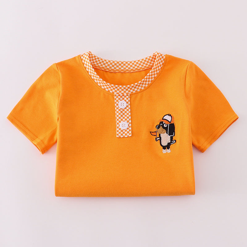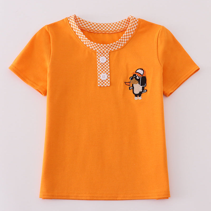 • Bright orange tee with embroidered dog mascot applique