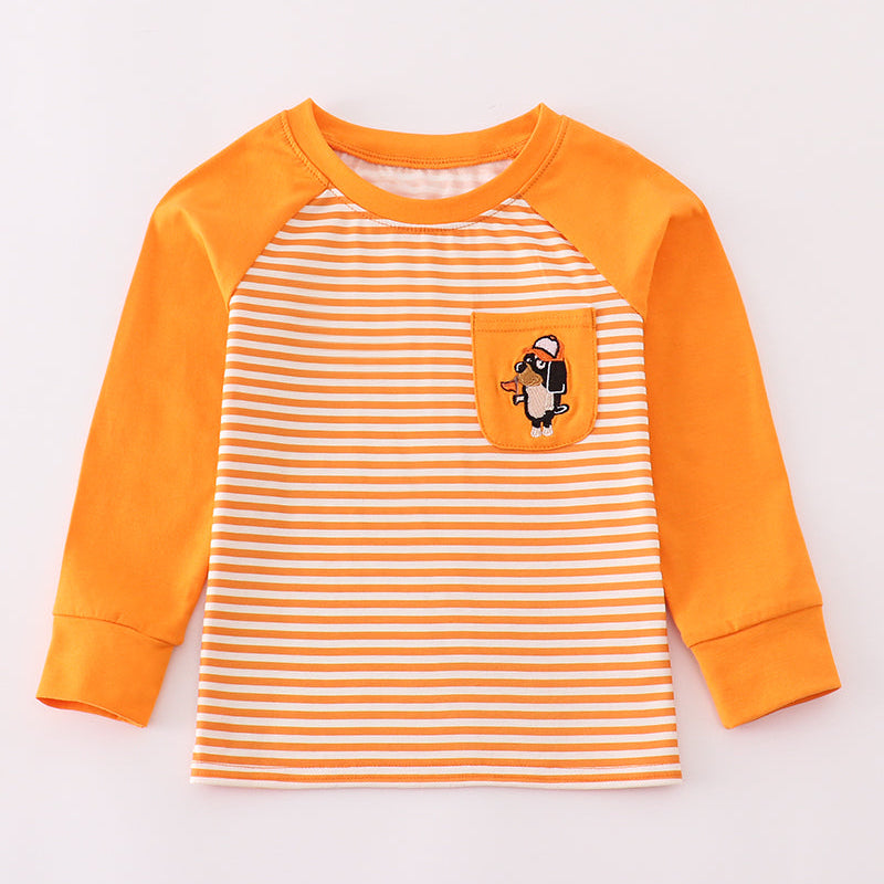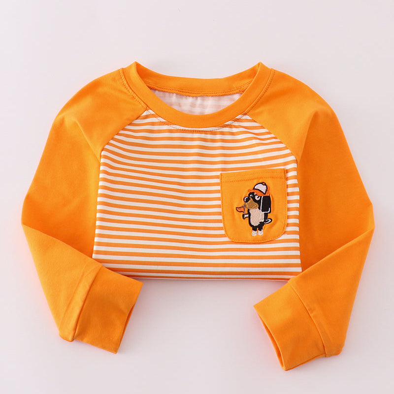 The shirt features bright orange raglan sleeves paired with crisp white-and-orange stripes for a playful, athletic look. A small chest pocket showcases an adorable mascot-style pup appliqué wearing a game-day hat—adding the perfect touch of Volunteer personality without overwhelming the design.