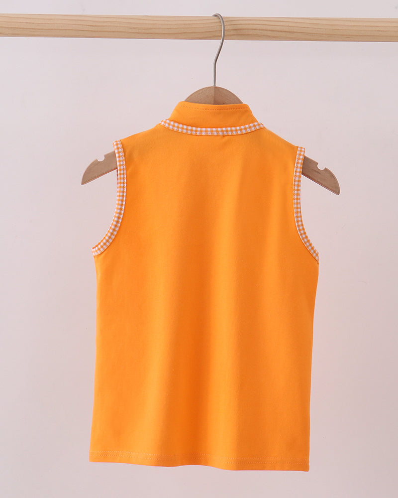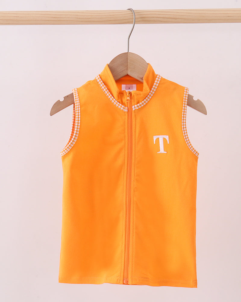 Designed in vibrant Tennessee orange, it features a white “T” embroidery on the chest and gingham check trim along the collar and arm openings — a subtle nod to classic southern style. The zip-front closure makes it easy to layer over tees or long sleeves, keeping your boy comfy while showing team pride.