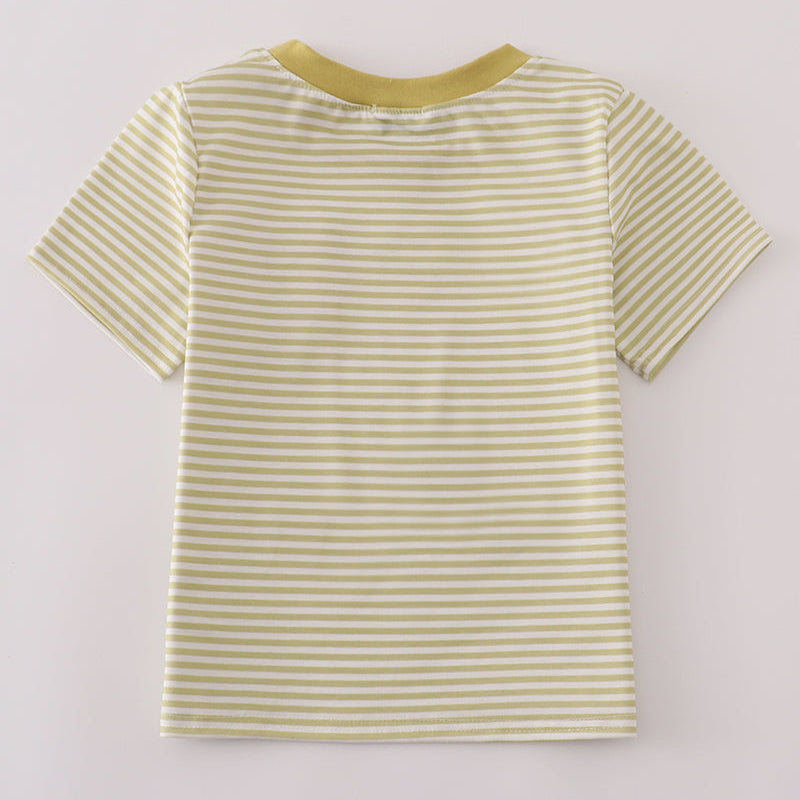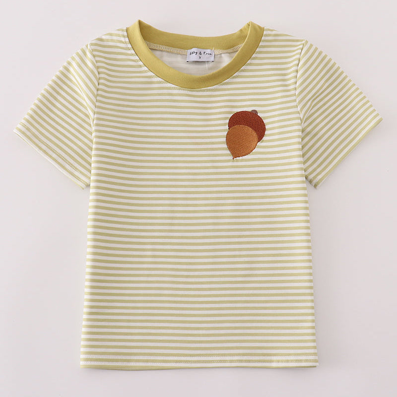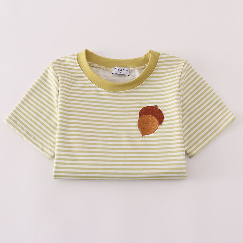 Get your little one autumn-ready with our charming Striped Fall Acorn Embroidery Boy Top! Featuring soft sage and white stripes, this classic short-sleeve tee is accented with an adorable acorn embroidery for the perfect fall touch. Made from breathable, high-quality fabric, it ensures all-day comfort whether he’s off to a pumpkin patch, family gathering, or enjoying playtime outdoors. The simple yet stylish design makes it an easy go-to for any casual fall outfit.