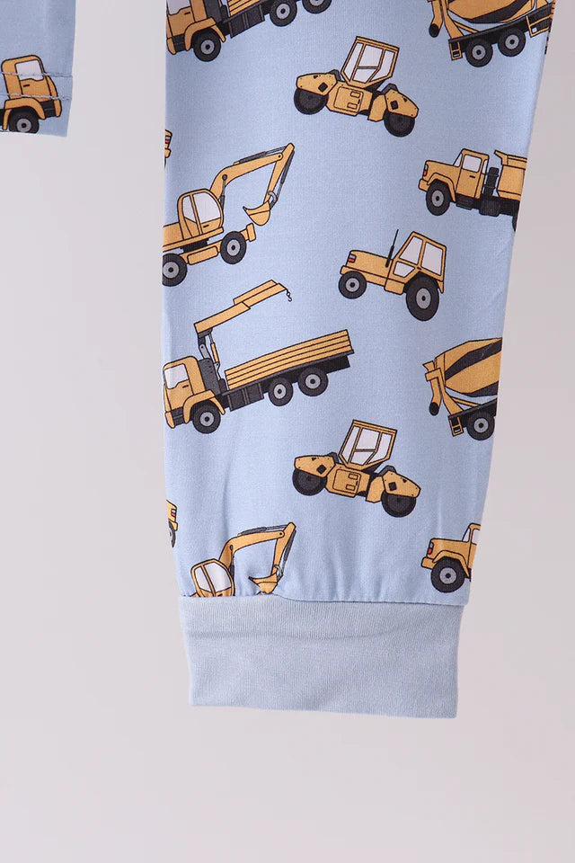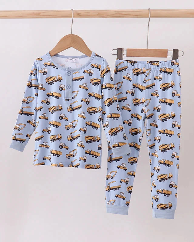 Dream big with the Excavator Adventures Bamboo Boy Pajama Set, perfect for little builders who love trucks and construction fun! Featuring an all-over print of excavators, dump trucks, and cement mixers on a soft blue backdrop, these pajamas bring bedtime to life with playful charm.