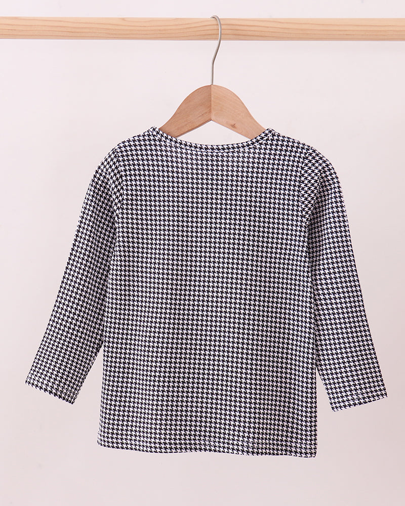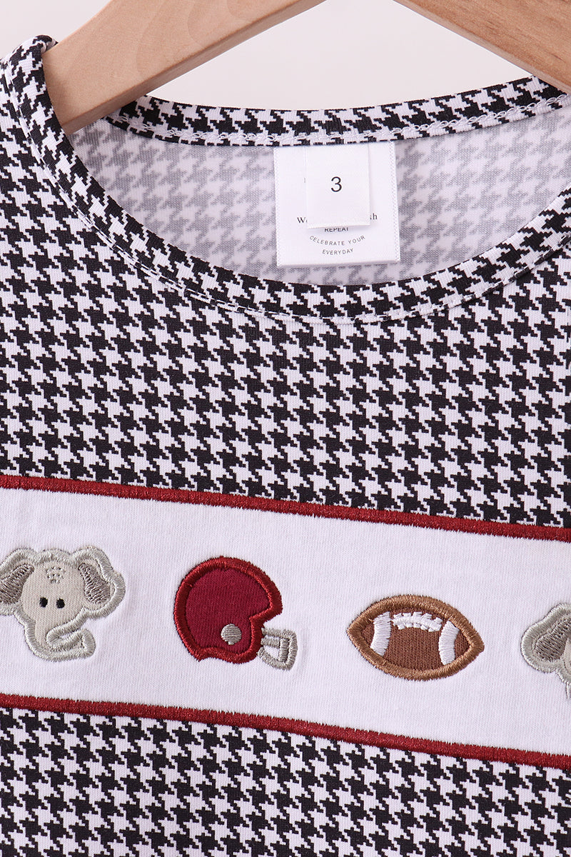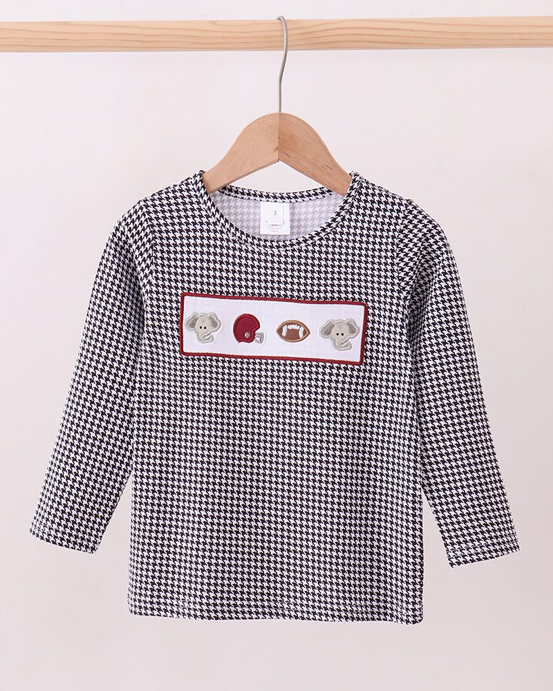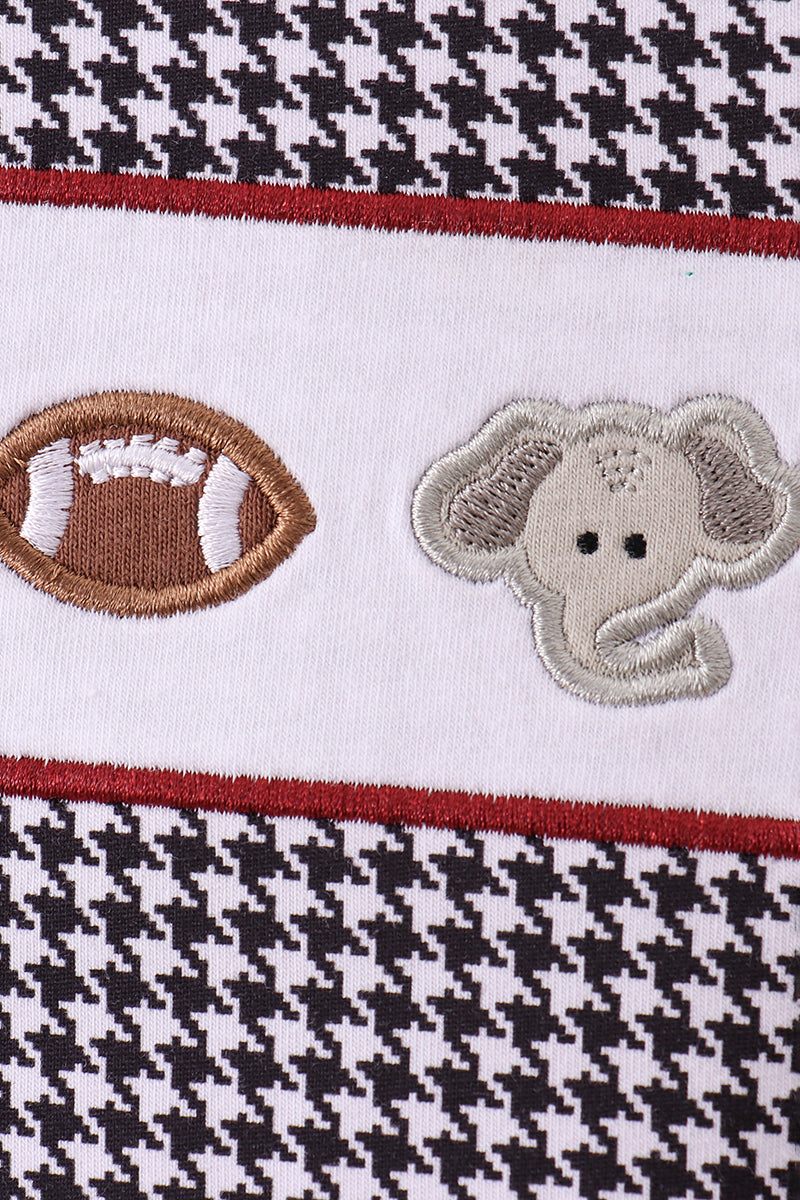 Your little fan will look game-day ready in the Bama Spirit Elephant Boy Top! Featuring classic black and white houndstooth with a playful embroidered panel of elephants, a football, and a crimson helmet, this top brings Alabama pride to every outing.