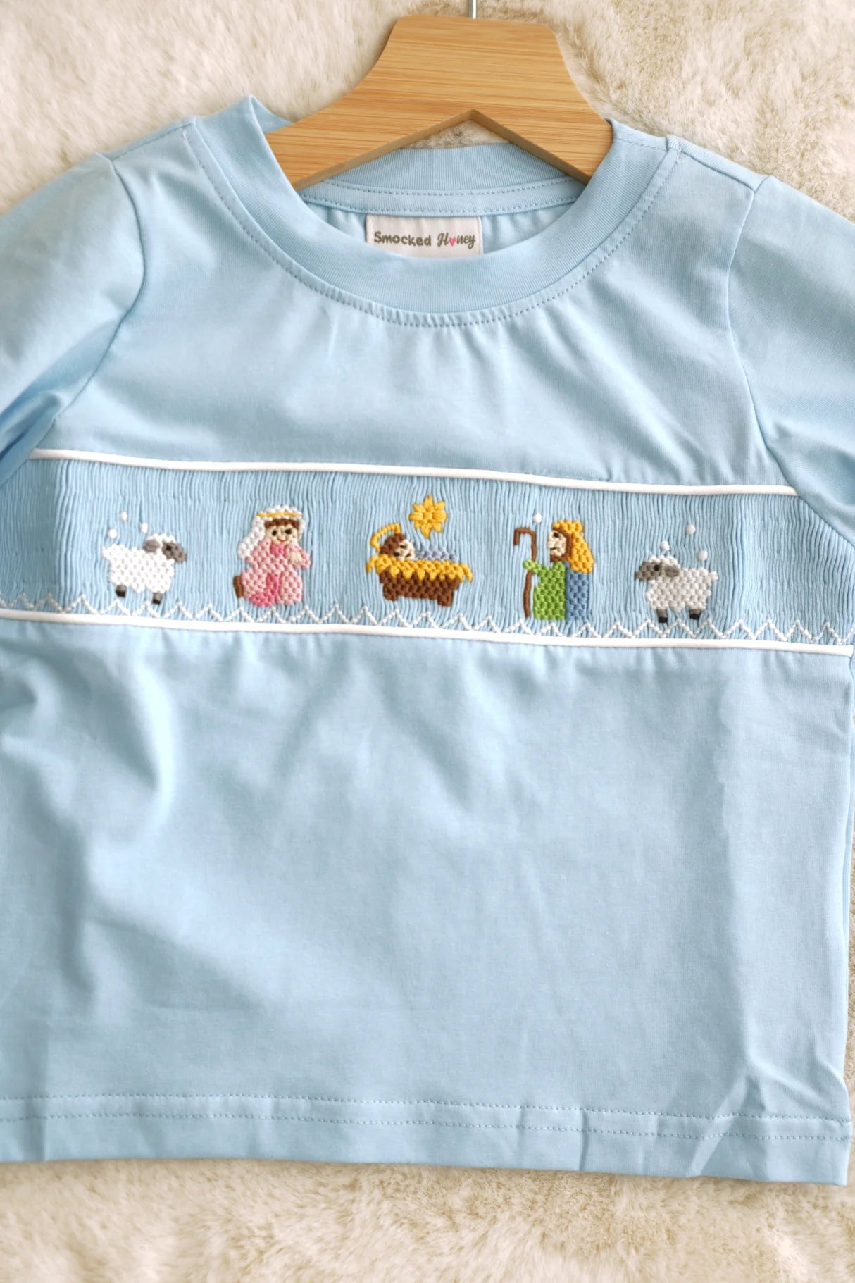 Celebrate the beauty and meaning of the season with the Blessed Nativity Blue Smocked Boy Pants Set. This classic two-piece outfit features a soft long-sleeve top adorned with a beautifully hand-smocked Nativity scene—complete with Baby Jesus in the manger, Mary, Joseph, and sweet little lambs. Every stitch adds sentimental charm and heirloom quality.