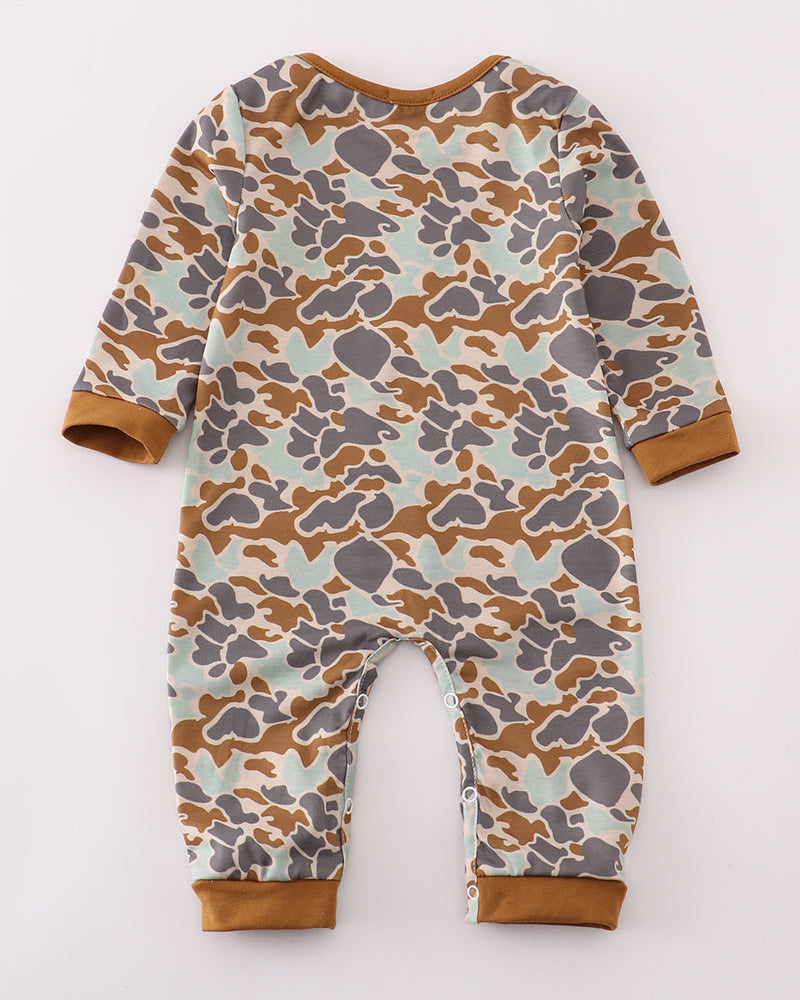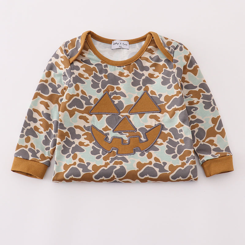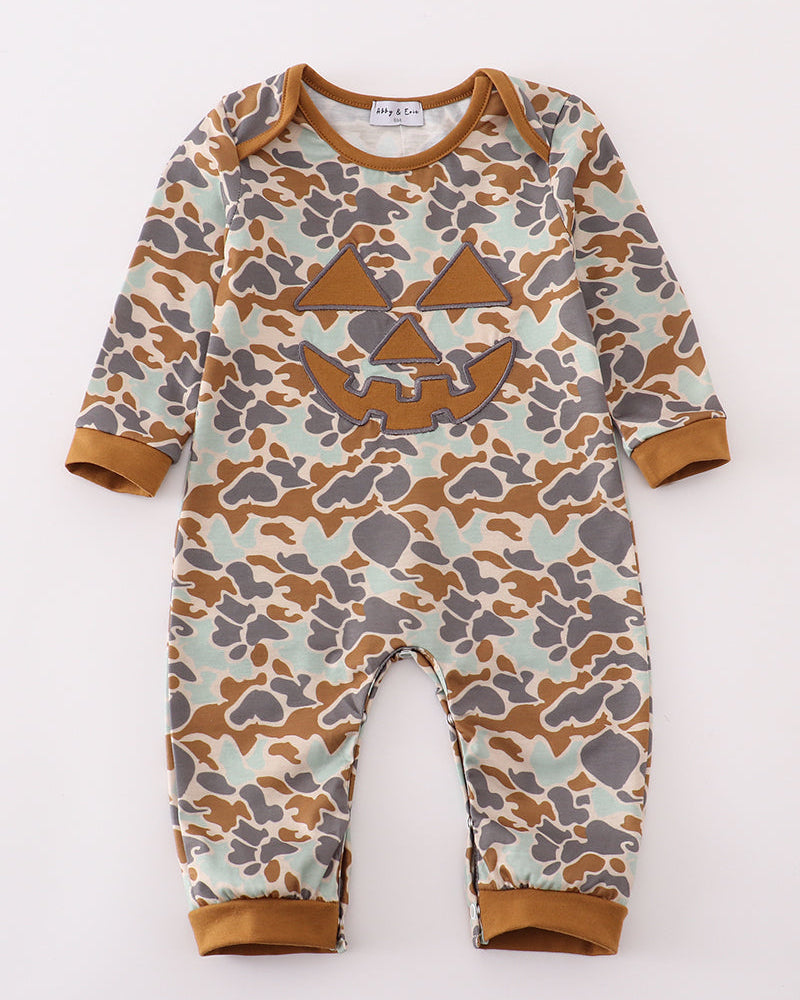Get your little one ready for spooky season with this Camo Jack-O’-Lantern Appliqué Halloween Boy Romper! Featuring an all-over camouflage print and a bold jack-o’-lantern appliqué, this cozy romper is perfect for pumpkin patch visits, Halloween parties, and festive photo ops. Crafted from soft, breathable cotton, it offers easy snap closures for quick diaper changes and ribbed cuffs for a snug fit. A must-have for your baby boy’s fall wardrobe!