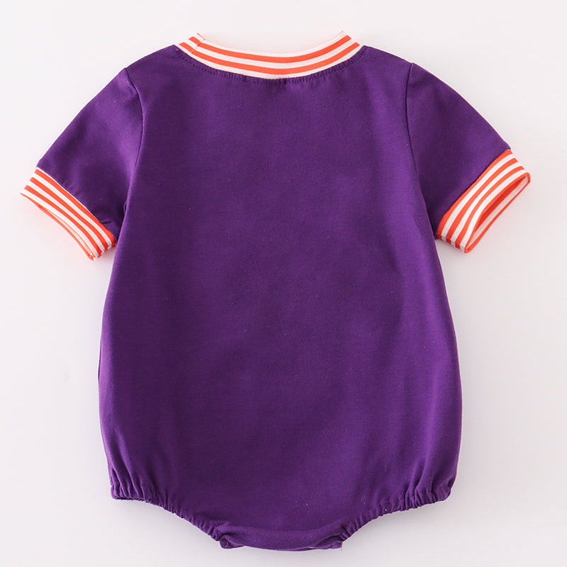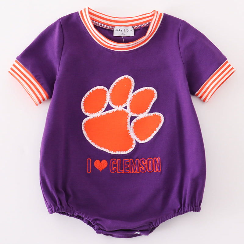 Dress your little fan in team spirit with the Clemson Cutie Game Day Boy Bubble! This purple short-sleeve bubble features a bold orange paw appliqué and “I ❤️ Clemson” embroidery, making it the perfect outfit for cheering on the Tigers with family.