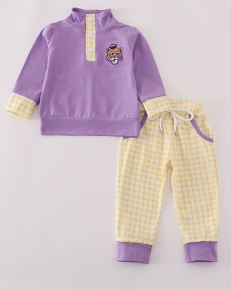Let your little fan cheer in comfort and style with the Geaux Tigers Purple & Gold Gingham Pants Set. This adorable two-piece outfit features a cozy purple pullover top with a yellow gingham button placket and cuffs, plus an embroidered tiger mascot for the perfect LSU-inspired look.
