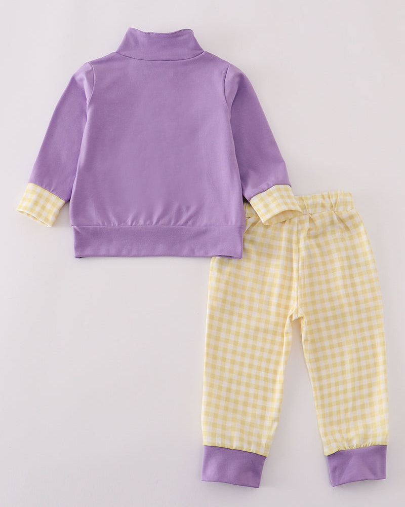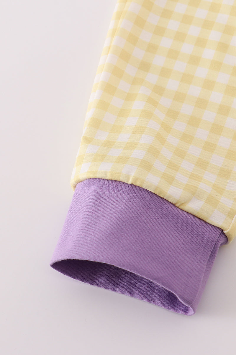 The matching yellow-and-white gingham pants have purple trim, a drawstring waist, and ribbed ankle cuffs for a comfortable, secure fit. Made from soft, breathable fabric, this set is ideal for game days, school spirit events, or everyday wear.