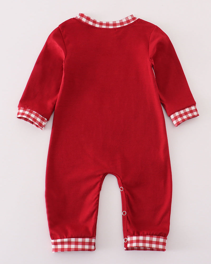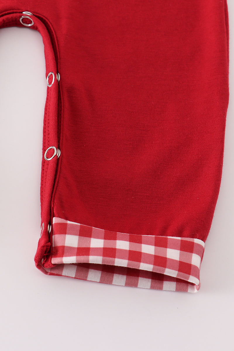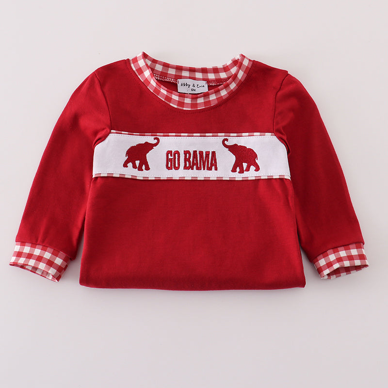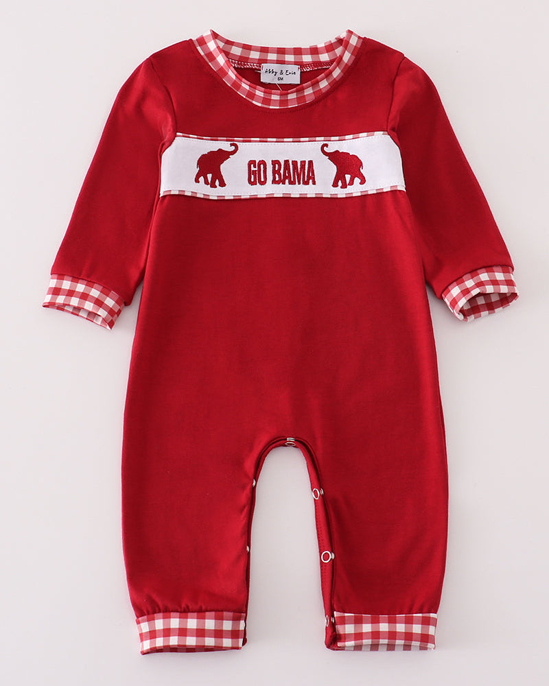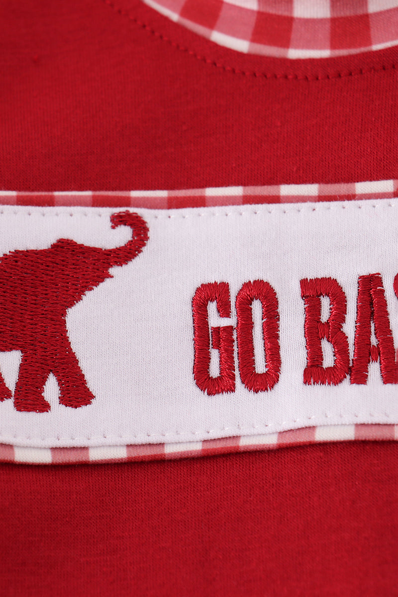 Get your little fan game-day ready with our Go Bama Elephant Embroidered Alabama Boy Romper. This adorable red romper features a bold “GO BAMA” embroidery with iconic elephant appliqués, celebrating Alabama pride in style. The checkered gingham trim on the neckline, sleeves, and leg cuffs adds a classic southern charm, making it perfect for tailgates, family gatherings, or cheering from home.