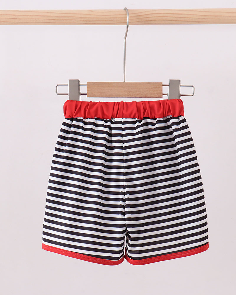 Get your little fan ready for summer fun with the Go Dawgs Sideline Smocked Stripe Boy Swim Trunks. These classic swim trunks feature timeless black and white stripes, bold red trim, and embroidered “Go Dawgs” bulldog detailing for the ultimate game day swim look.