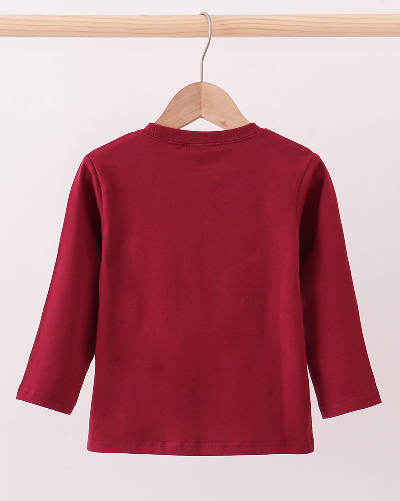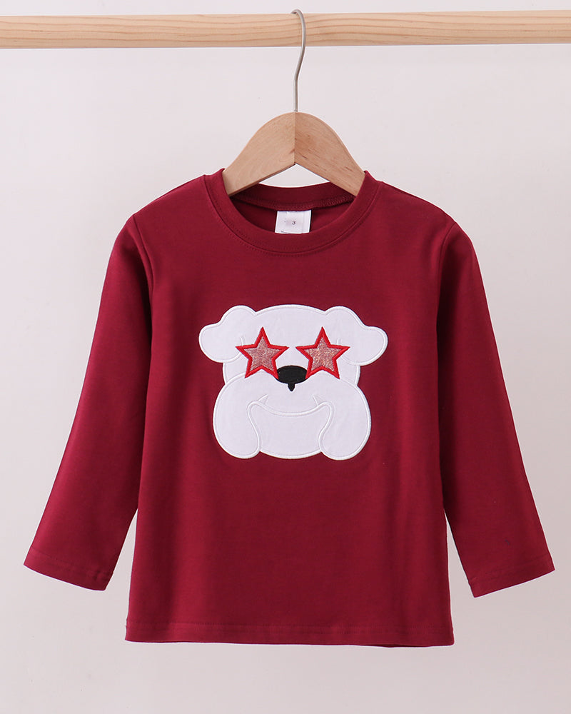 This maroon long-sleeve tee features an adorable bulldog applique with bold star-shaped eyes—perfect for little fans who love to cheer on their favorite team. Made from soft, breathable fabric, it keeps your boy comfy for game days, school spirit events, tailgates, and everyday wear. Durable stitching ensures this top stays looking great wash after wash. Pair it with jeans, joggers, or team-color bottoms for the ultimate gameday look!