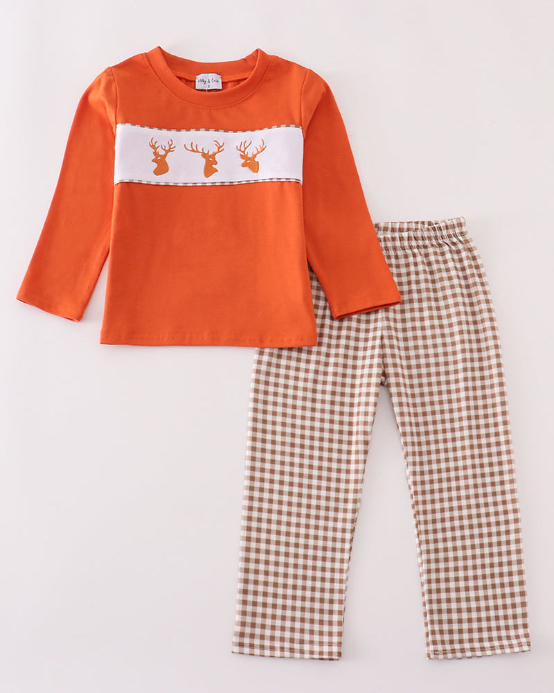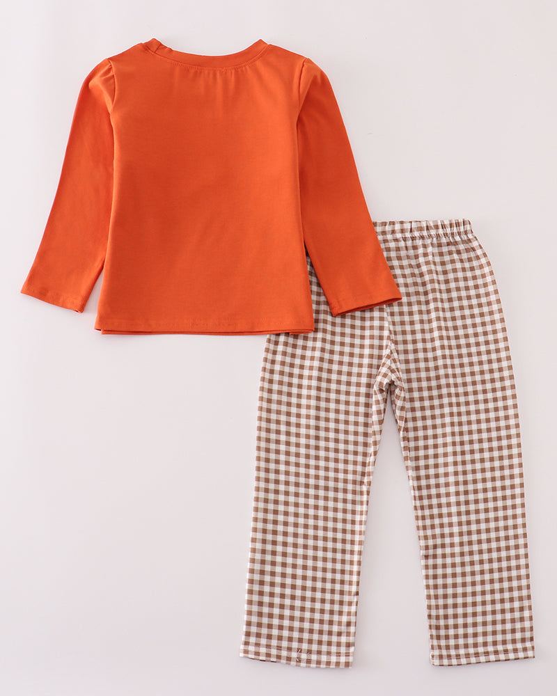Get him ready for fall adventures with the Harvest Hunt Deer Embroidered Gingham Boy Pants Set! Featuring a soft orange long sleeve top with charming deer head embroidery and contrast gingham trim, this set pairs perfectly with classic brown gingham pants for a cozy, rustic look. Ideal for pumpkin patch visits, family photos, and Thanksgiving gatherings, this outfit blends seasonal charm with everyday comfort.