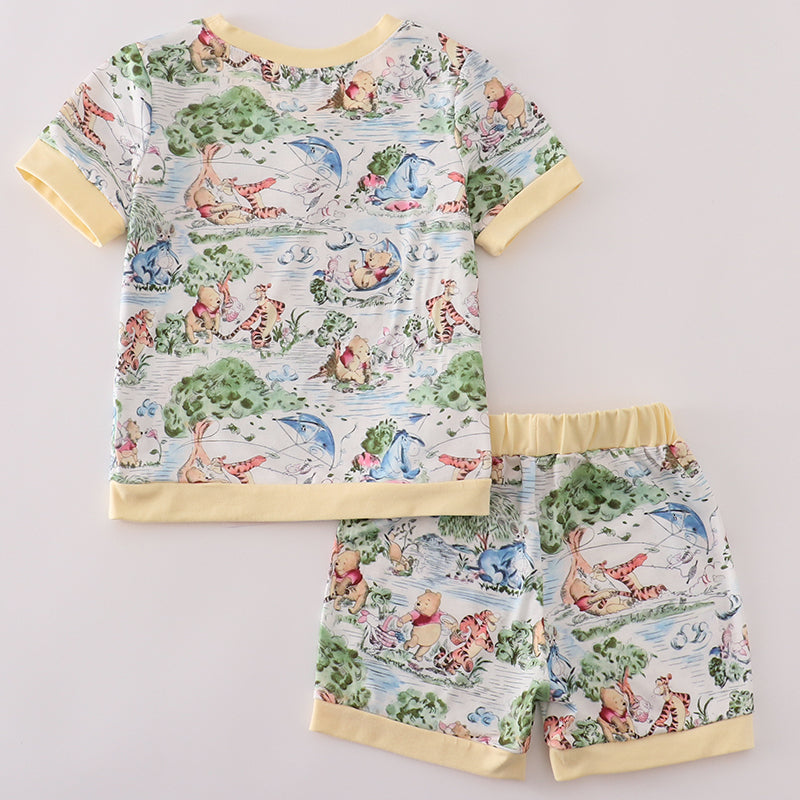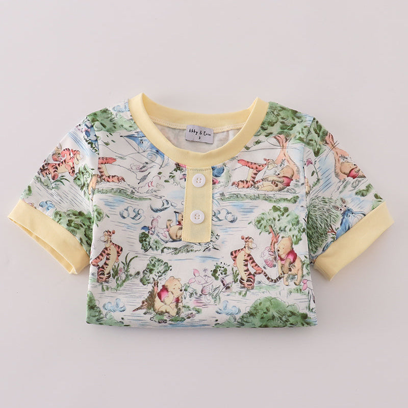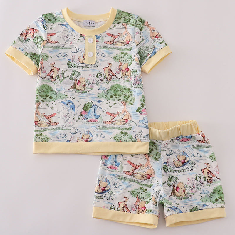 Bring storybook magic to playtime and bedtime with our Hundred Acre Adventures Boy Shorts Set! Featuring a charming all-over print inspired by beloved woodland friends, this two-piece outfit is as sweet as childhood itself. The buttery-soft knit fabric keeps little ones comfy all day, while the contrast yellow trim adds the perfect sunny touch. The henley-style top pairs effortlessly with the matching shorts, making this set ideal for warm weather, vacations, lounging, or picture-perfect memories. A whimsical must-have for any little adventurer!