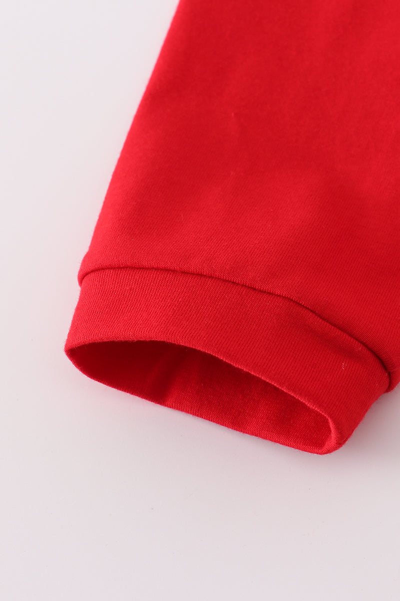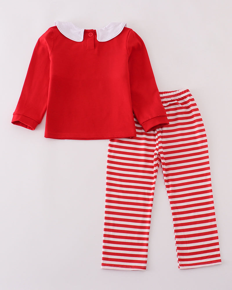 - Bright red long-sleeve top with a crisp white Peter Pan collar for classic charm.