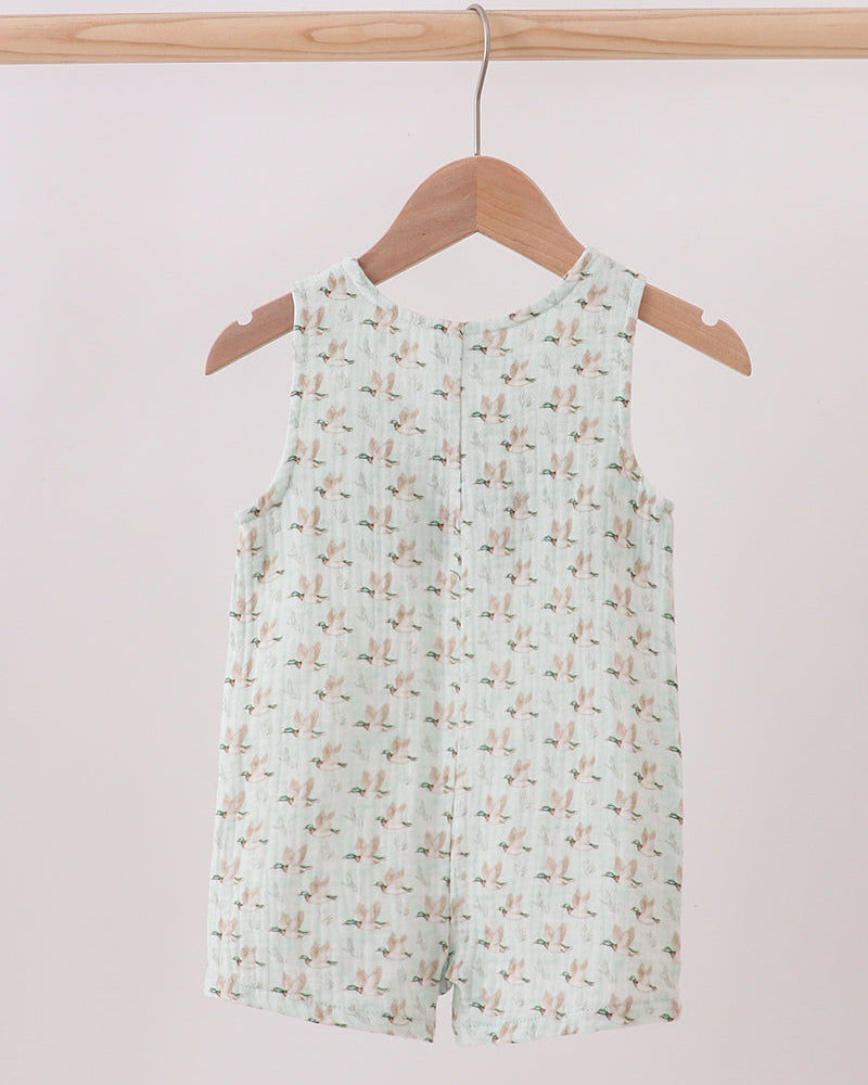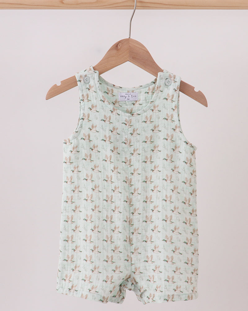 The Meadow Duck Muslin JonJon brings timeless charm and comfort to your little one’s wardrobe. Made from premium cotton muslin, this sleeveless romper is lightweight, breathable, and perfect for all-day wear. The soft meadow-green background features a whimsical flying duck print, making it a stylish choice for playdates, portraits, or special occasions. Designed with button straps and snaps at the bottom, it ensures easy dressing and diaper changes.