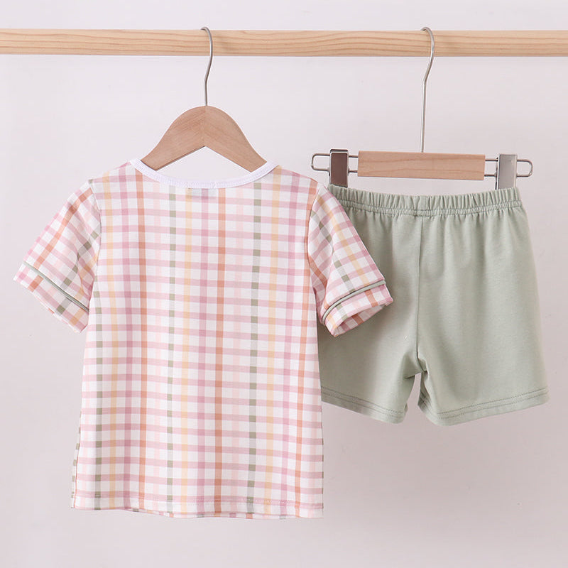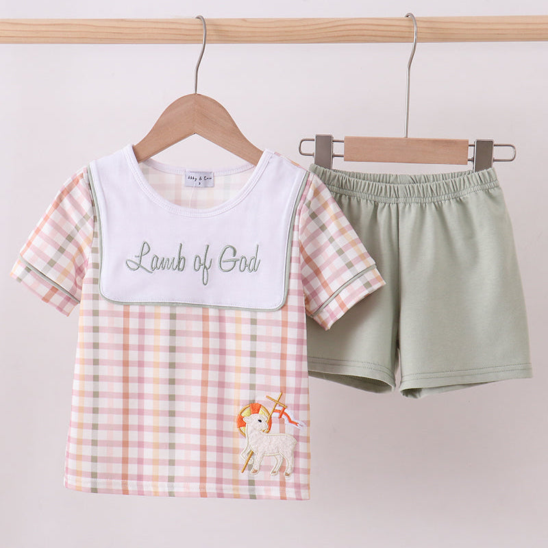 Dress your little one in meaningful style with the Precious Lamb of God Plaid Boy Shorts Set. This charming two-piece outfit features a soft pastel plaid top with a classic embroidered “Lamb of God” neckline and lamb appliqué, paired with coordinating solid shorts for a timeless, faith-filled look.