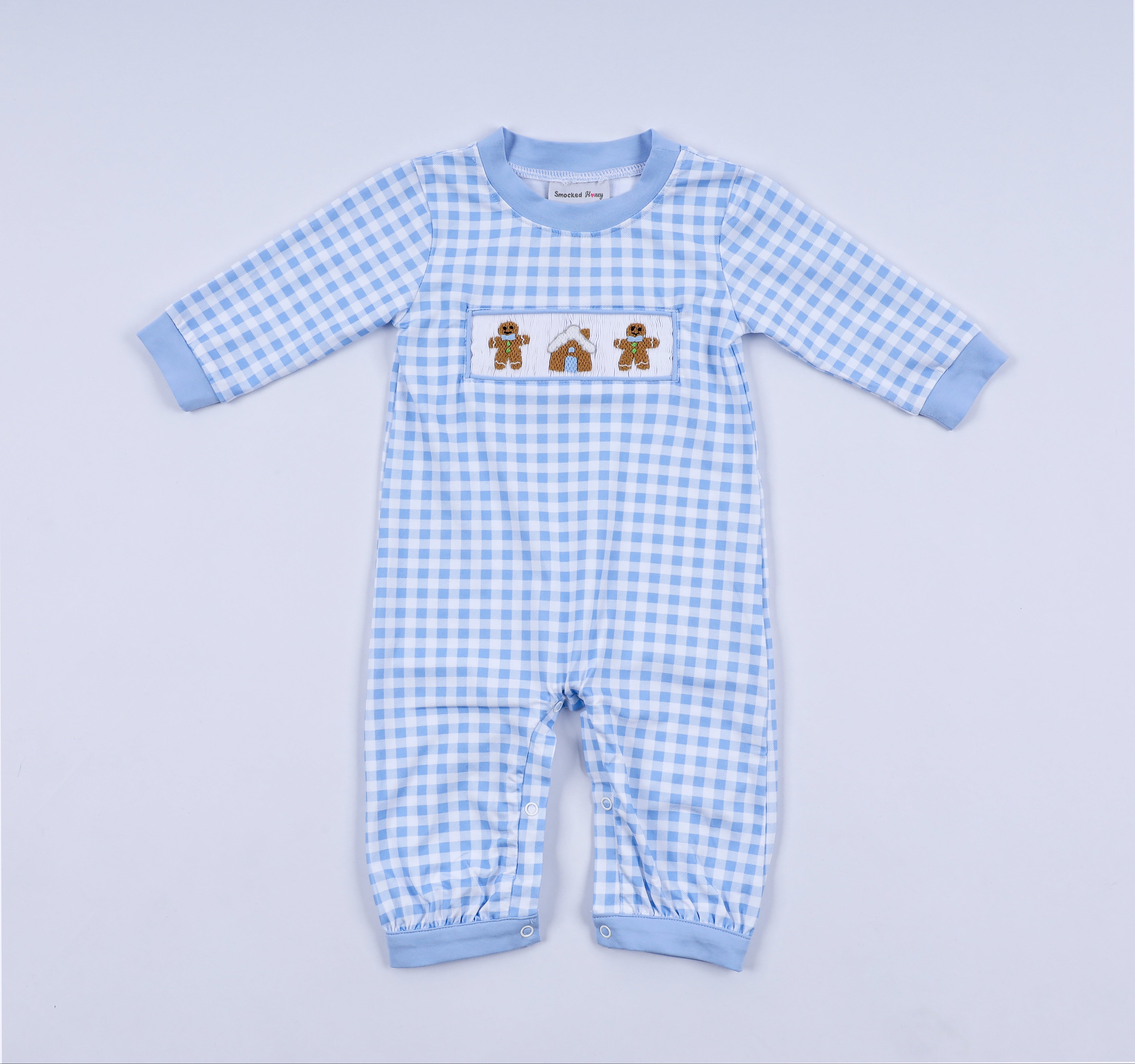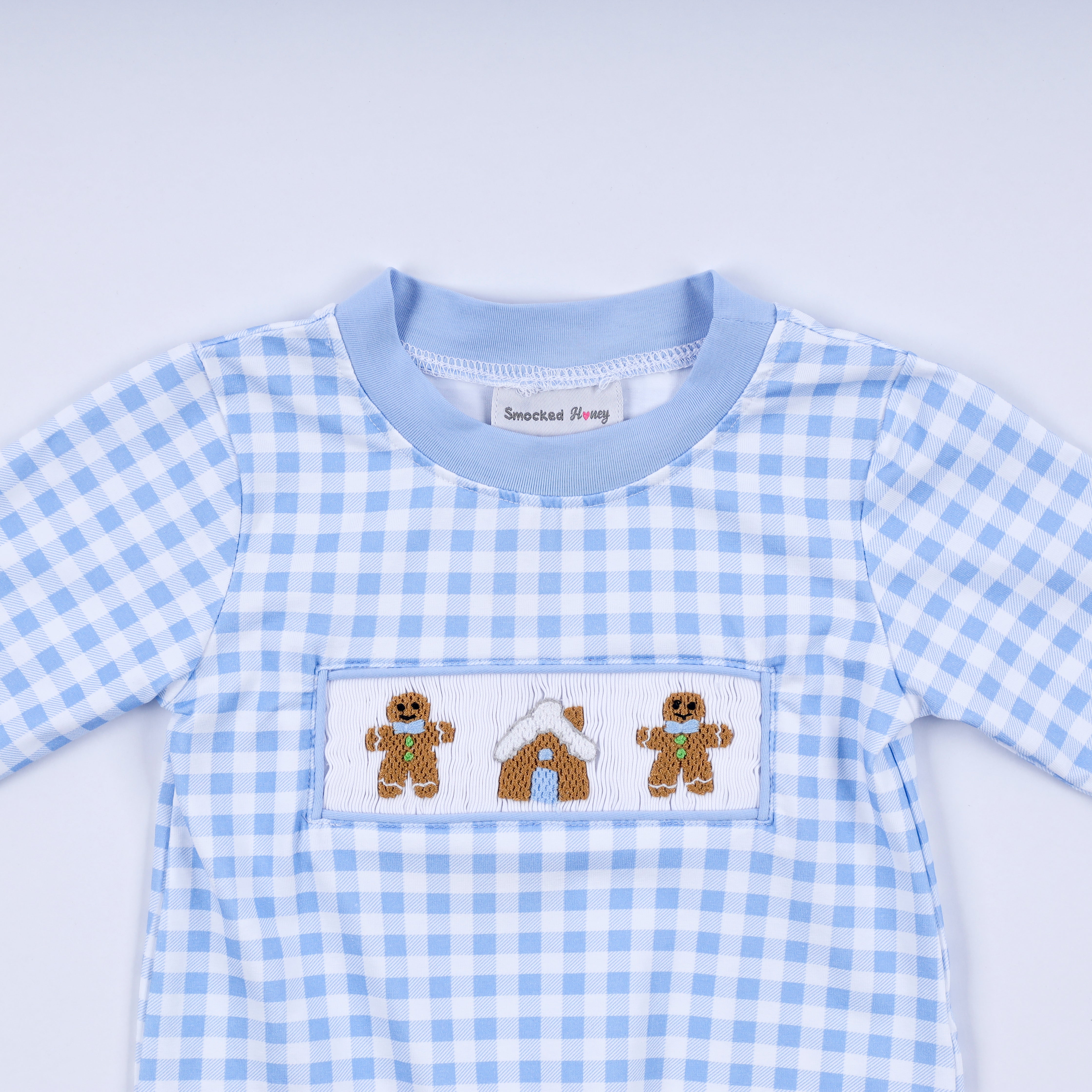 Your little one will look absolutely adorable in our Sweet Gingerbread House Blue Smocked Romper. This charming holiday romper features a classic blue gingham print and a beautifully smocked panel showcasing gingerbread boys and a gingerbread house—perfect for festive celebrations and cozy winter days.