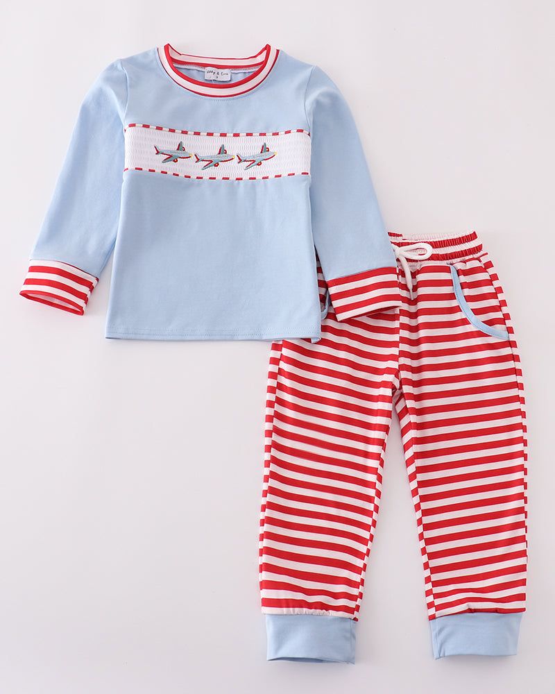 Take Flight Smocked Red Stripe Airplane Embroidered Boy Pants Set