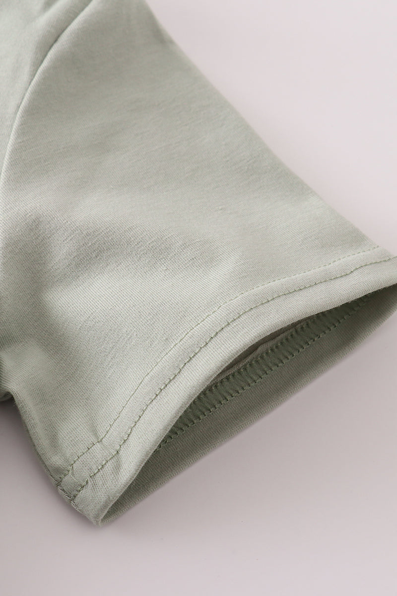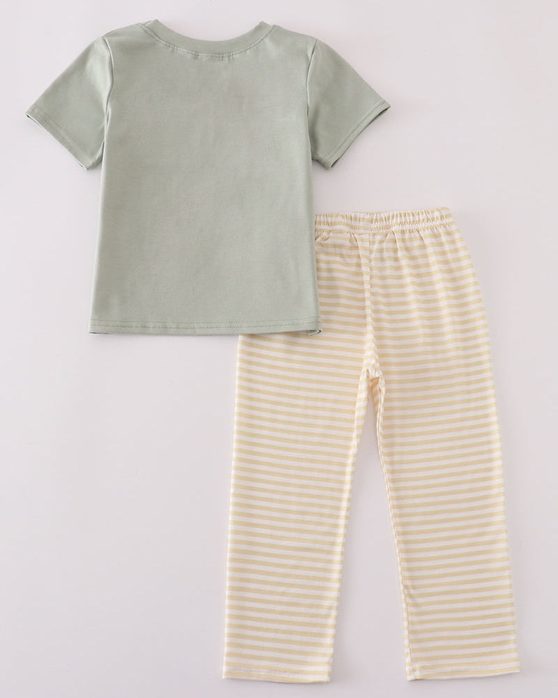 The Woof Trio Embroidered Smocked Boy Pants Set is a playful and comfortable outfit for little dog lovers. This two-piece set features a sage green short-sleeve tee with a smocked chest panel embroidered with three adorable puppy faces in brown, tan, and black.