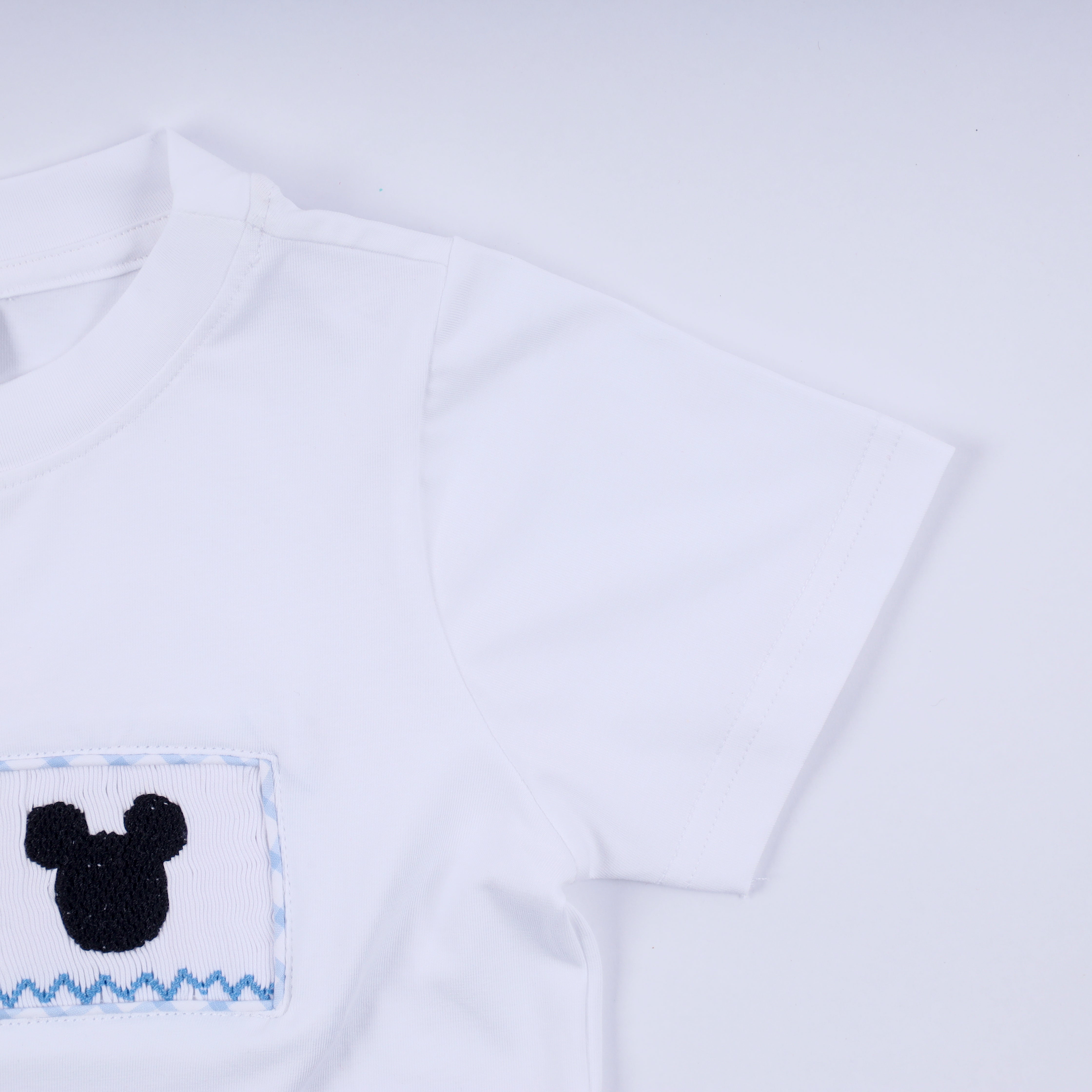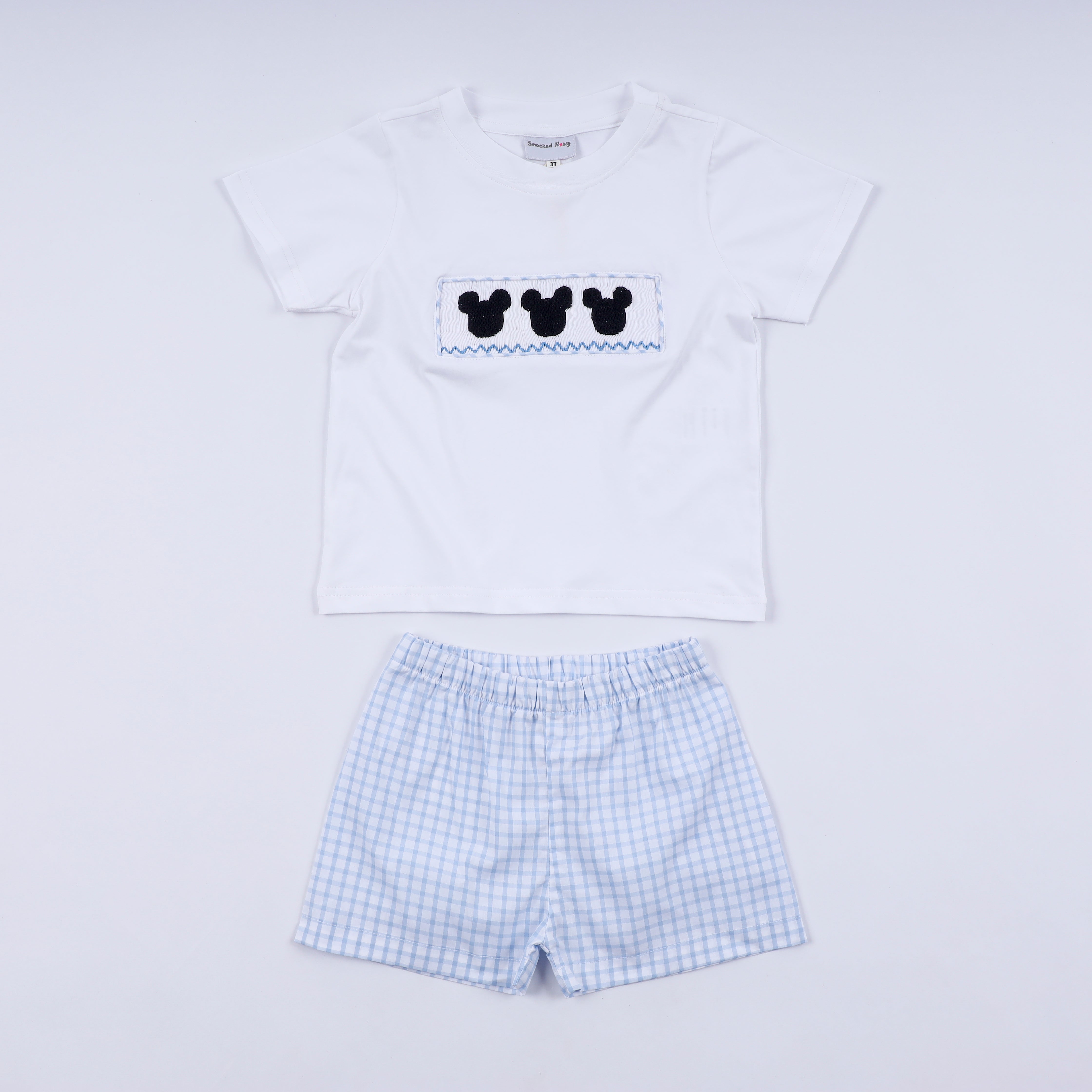 Bring timeless charm to your little one’s wardrobe with our Classic Mouse Smocked Blue Gingham Boy Shorts Set. This precious outfit features a hand-smocked mouse silhouette trio stitched with exquisite detail across a soft white knit top. Paired with coordinating blue gingham shorts, this set blends comfort, craftsmanship, and childhood magic effortlessly.