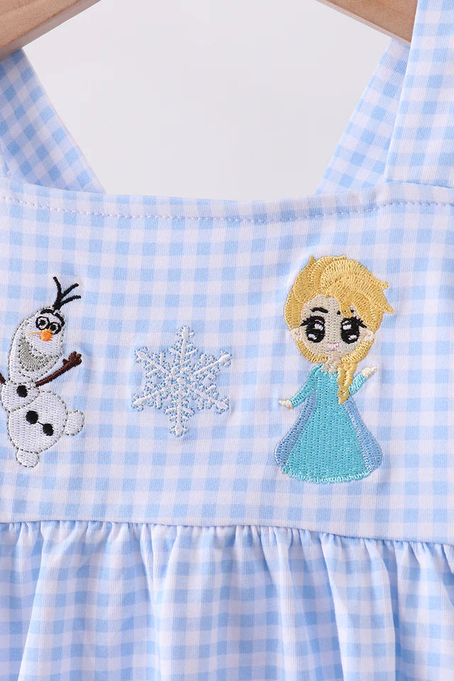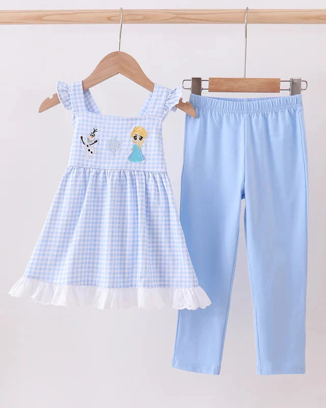 Let your little one step into a world of winter magic with our Frosted Princess Embroidered Ruffle Girl Pants Set. This enchanting outfit features a soft blue gingham top with ruffle straps, princess-inspired embroidery, and delicate lace trim. Paired with coordinating pastel blue leggings, it’s the perfect mix of comfort and fairytale charm.