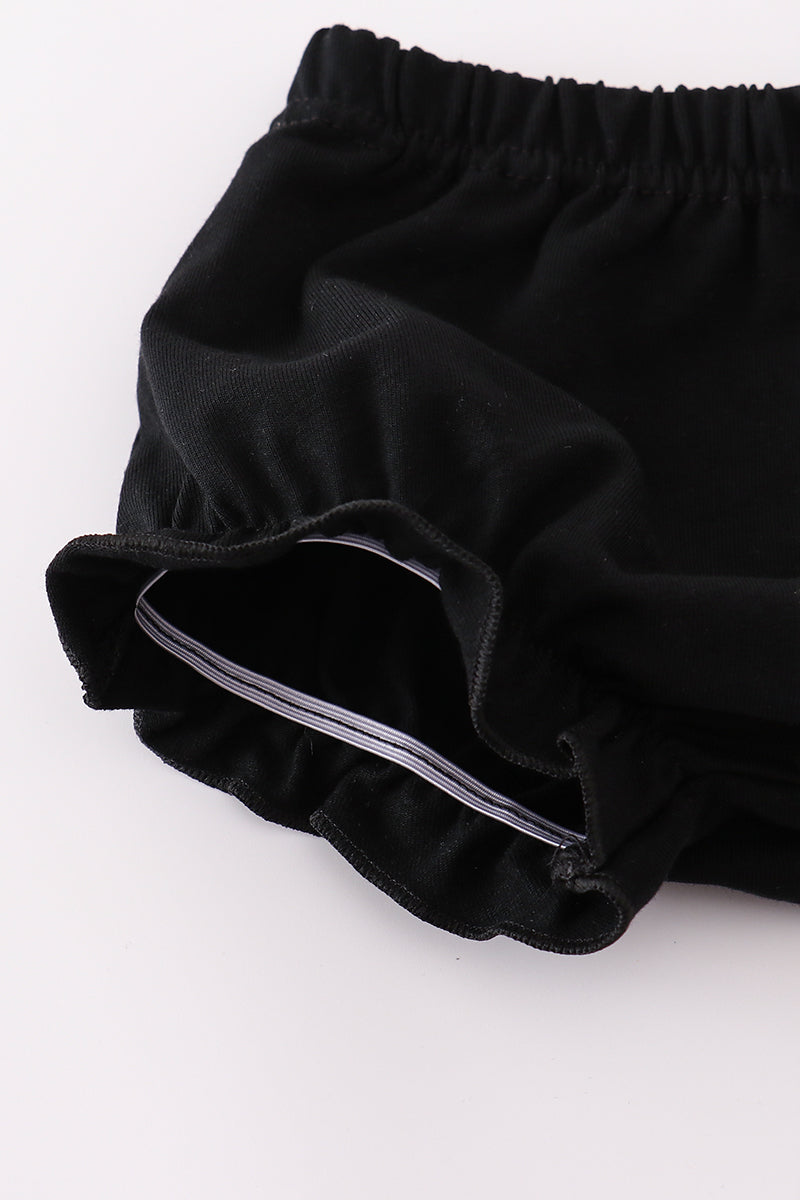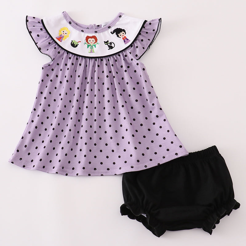 Your little one will cast a spell of cuteness in our Purple Polka Dot Witchy Sisters Halloween Girl Bloomers Set! This adorable two-piece outfit features a soft lavender polka dot tunic with flutter sleeves and an embroidered yoke showcasing three whimsical witch sisters, a cauldron, and a black cat. Paired with matching black ruffle bloomers, this set is perfect for Halloween parties, pumpkin patch adventures, or festive fall photos. Crafted from soft, breathable fabric for all-day comfort and style.