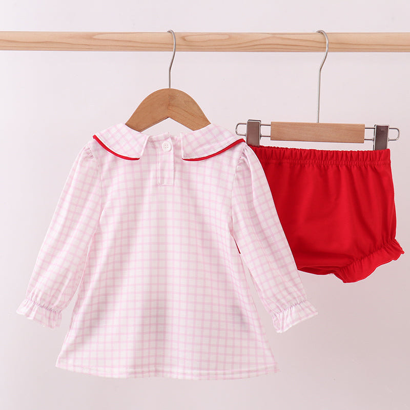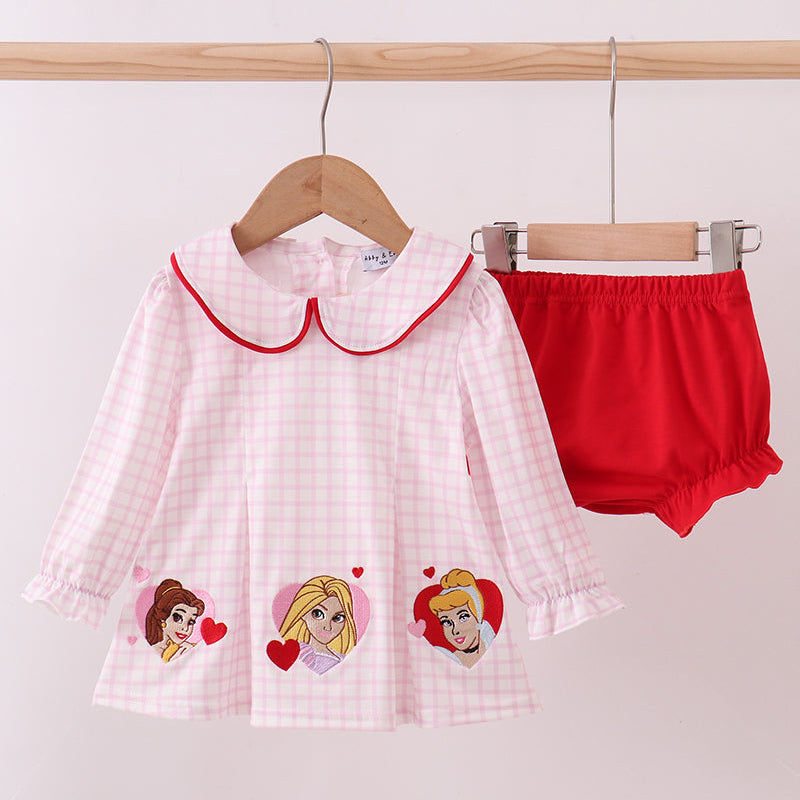 Let your little princess shine in our Royal Sweethearts Baby Bloomer Set — the sweetest fairytale Valentine outfit! This precious set features a pink gingham top with charming princess heart embroidery, flutter cuffs, and a classic Peter Pan collar trimmed in red for extra sweetness. Paired with darling red ruffle bloomers, it’s the perfect touch of royal charm and Valentine magic.