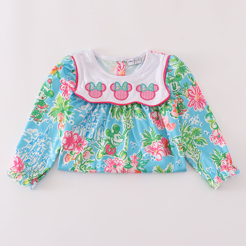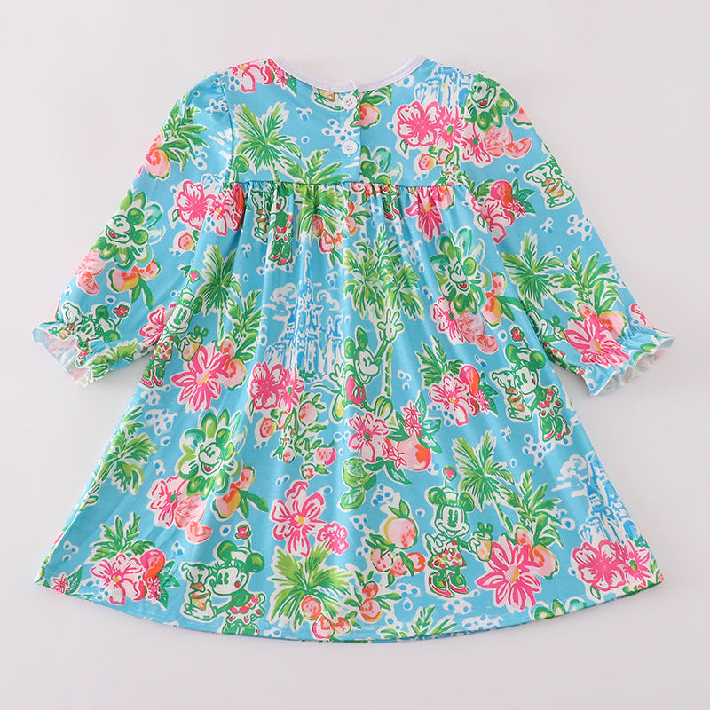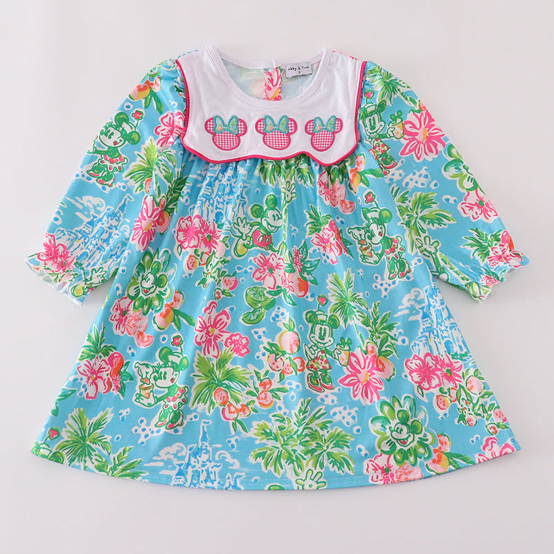 Bring tropical fun to her wardrobe with this adorable Tropical Mouse Character Applique Dress! Featuring a vibrant floral print with playful mouse character accents, this long-sleeve dress is topped with sweet gingham mouse head appliques on the chest. Made from soft, breathable fabric, it’s perfect for theme park trips, beach vacations, and everyday adventures.